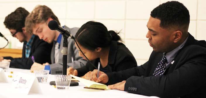 thing I was very uncomfortable with. It just stretches me to get out of my comfort zone,” Conrad, sporting a black suit and a pair of redrimmed glasses, said. The debaters are instructed to be very professional in their answers and always refer to one another by the name of the represented institution or simply as “our opponent.”
