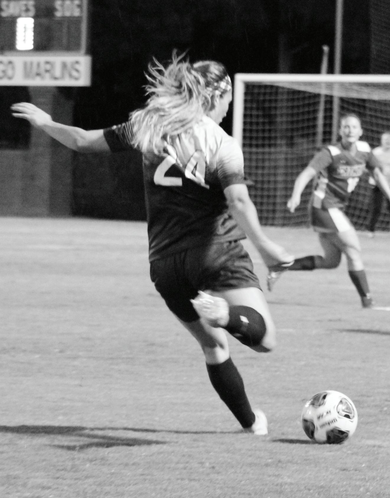 first from just outside of the box. Then, within 5 minutes the Marlins struck again with a goal from junior Ryan Kraus; he collected the ball after it bounced off of another player and put it into the net. Then the third goal, also scored by Kraus, put a header away off of a cross pass from Alex Surprise. “The whole team was just flowing tonight and everything just felt right. I was in the right spot at the right time,” Kraus said.
