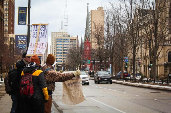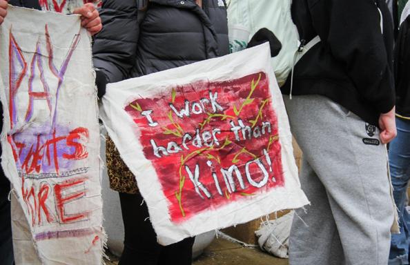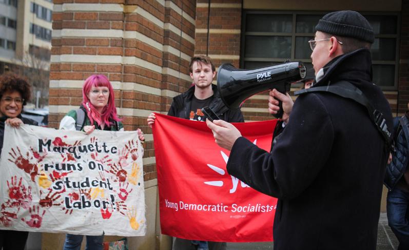 signs in hand, members of the rally could be heard and seen for blocks, with messages like “Marquette runs on student labor,” “Pay students more” and “I work harder than Kimo!”