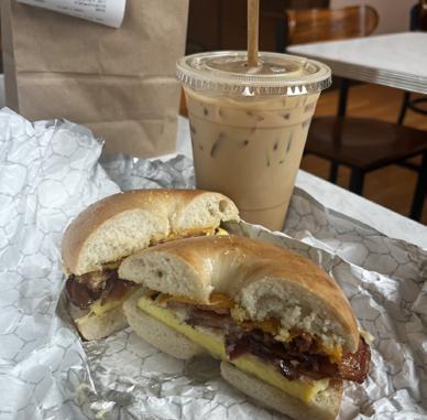 crunch and a savory smokiness to the sandwich. The two cheeses added depth, with a sharpness and tanginess blending into the already savory flavors of the sandwich. The bagel, of course, was warm and soft, with a crisp outside. The inside of the bagel was plush and perfectly hot, with the exterior adding a desirable crunch to every bite. While some bagels I’ve had in the past have been too tough, requiring me to rip each piece off, each bite from this Allie Boy’s sandwich came with ease. Although the bagel itself didn’t have a distinct flavor, it was the perfect foundation for a savory breakfast sandwich.