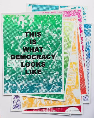 The screen-printed images above tackle democratic protests.