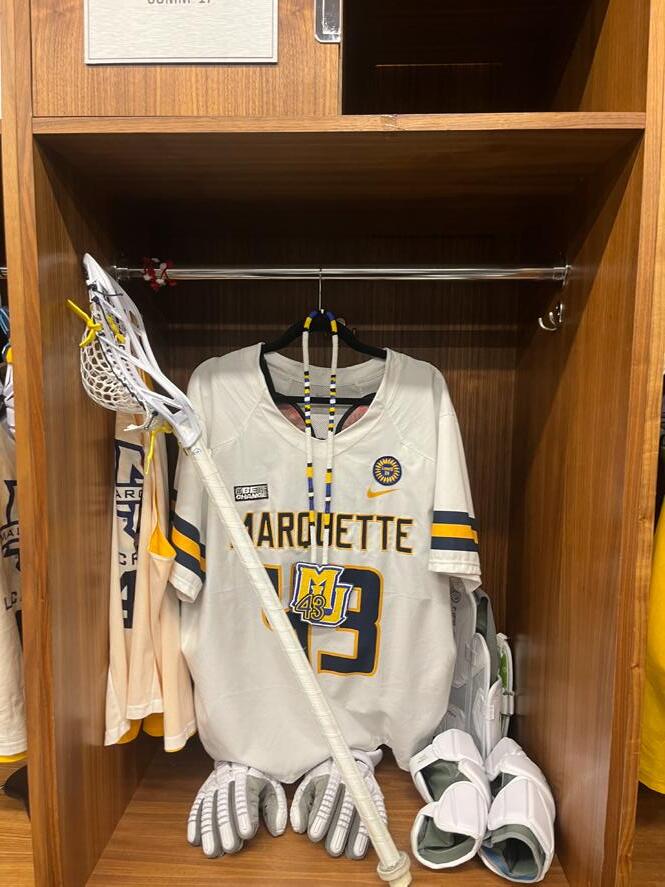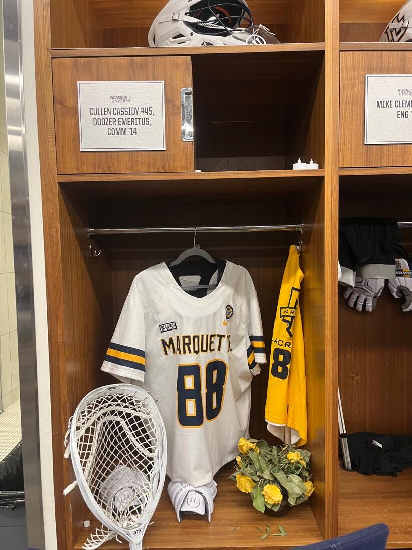 For the month of September, this was the Marquette men’s lacrosse locker room, transformed to a memorial for Noah Snyder and Scott Michaud. Every seat faced the tribute. Every