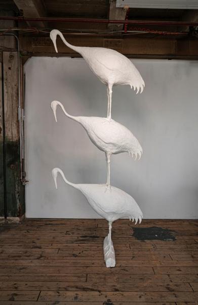 When approaching his section of the gallery, eight life-size birds made of mulberry paper are stacked one on top of the other, towering over 20 feet in the air.
