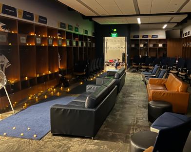The two jerseys hung in their main locker spaces, exactly where their bodies once sat. The helmets rested on the top shelves, with pads and cleats at the bottom. The gloves sat on the seats, flowers intertwining the