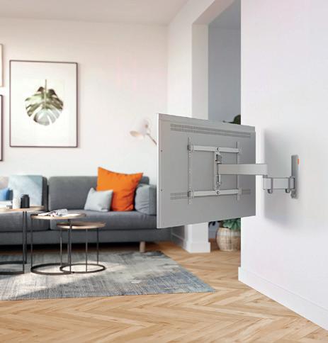 El soporte de pared para TV Elite Full-Motion+ TVM 5645 combina un diseño minimalista con un gran rendimiento. Ideal para grandes televisores Oled/Qled, es apto para TV de entre 40” y 77”, con un peso de hasta 45 kg. En la posición inicial, el televisor se monta a sólo 4 cm de la pared. Disponible en blanco y gris platino, puede girar hasta 180º, ofrece movimiento suave OneFingerTM, a la vez que 2D-Levelling™ garantiza que el televisor estará siempre nivelado (nivelación precisa después de la instalación, horizontal y vertical). Viene con sistema de organización de cables.