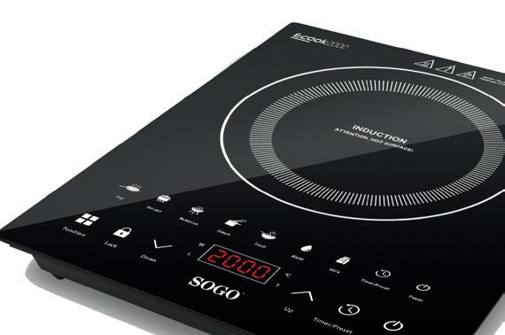 La cocina de inducción digital portátil SS-10245 dispone de una amplia zona de cocción de 22x22 cm (medida base de sartén) y ofrece 10 opciones de potencia (120 W-2.000 W), así como 8 ajustes de temperatura (60°-300 °C) y 7 funciones de menú: freír, cazuela, barbacoa, cocina al vapor, sopa, agua, leche. De alta resistencia térmica y con distribución equitativa de calor, cuenta con panel de control digital con control táctil, pantalla de luz LED que indica la hora y la temperatura actual, y temporizador: 0-240 minutos y función de cocción con inicio retardado. Además, posee protección contra sobrecalentamiento y sobrecargas de tensión.