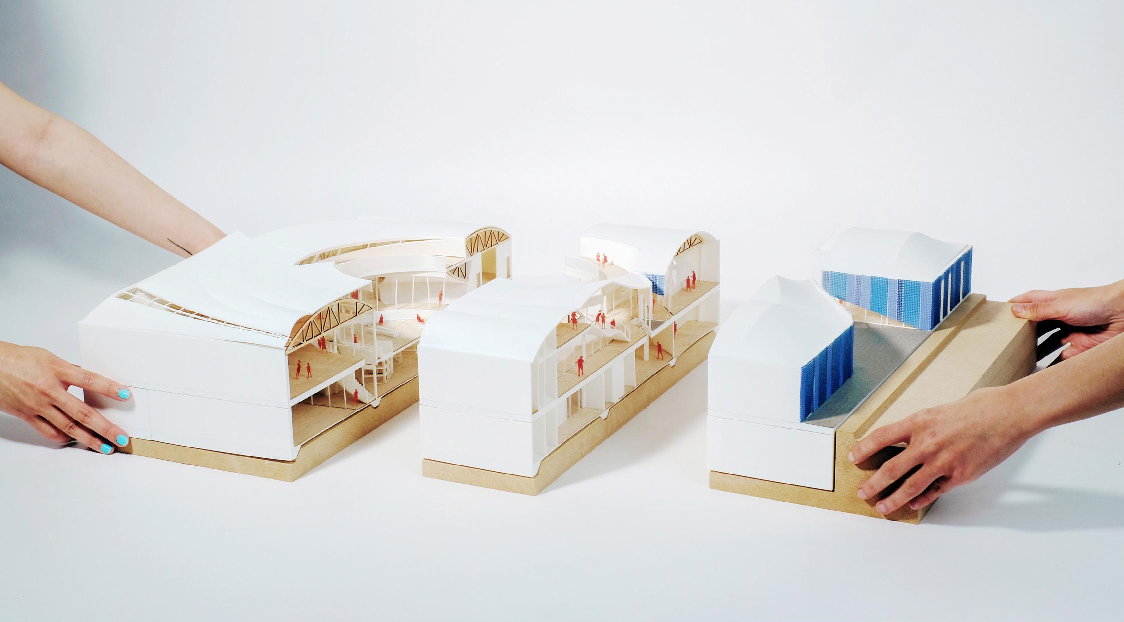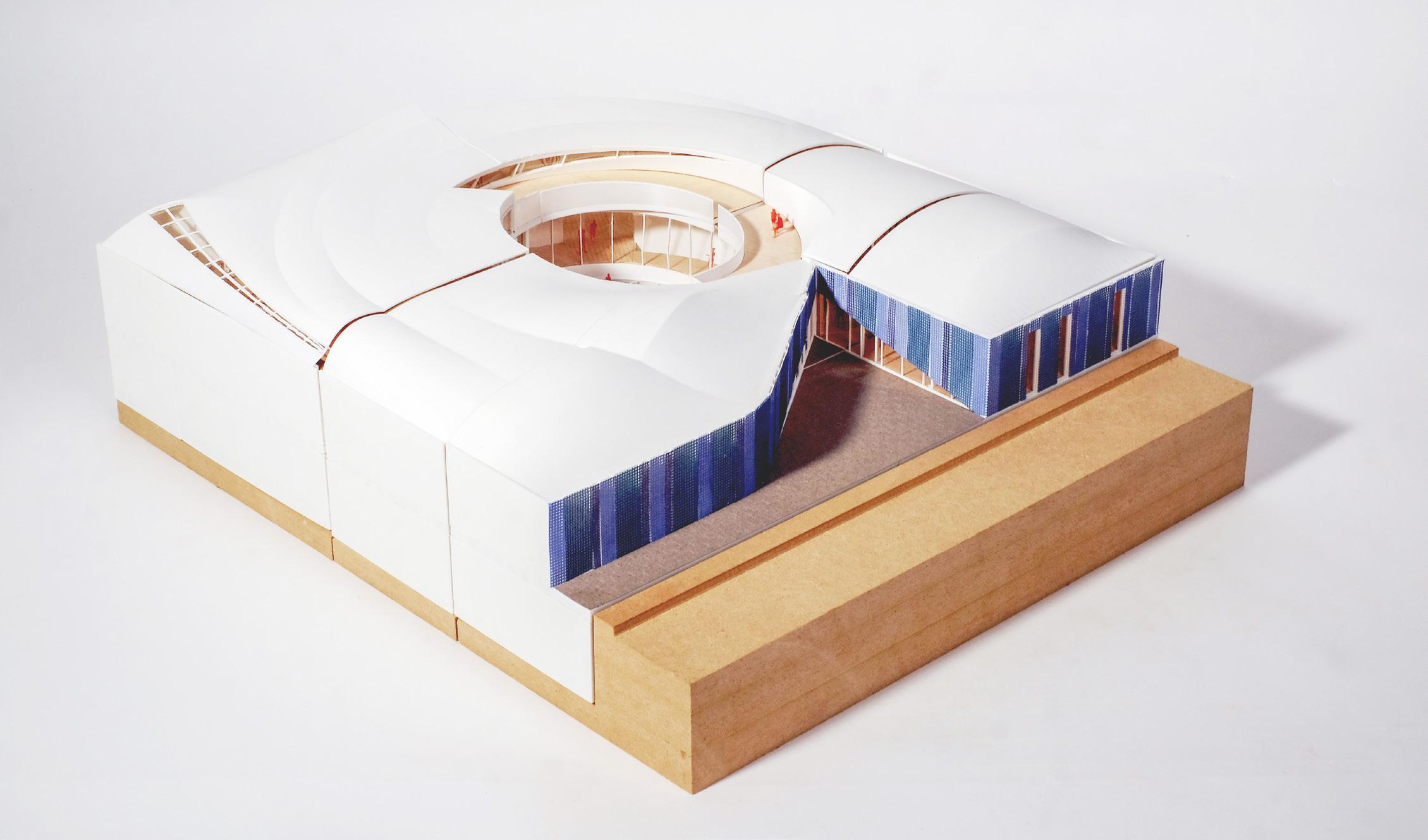 For the massing, a rotation is introduced, establishing a relationship between rotational and orthogonal lines. A new figure is added, and the smooth curve of this figure enhances the front area, creating an inviting space that guides both students and the public toward the main entrance.