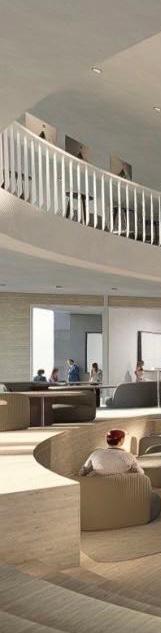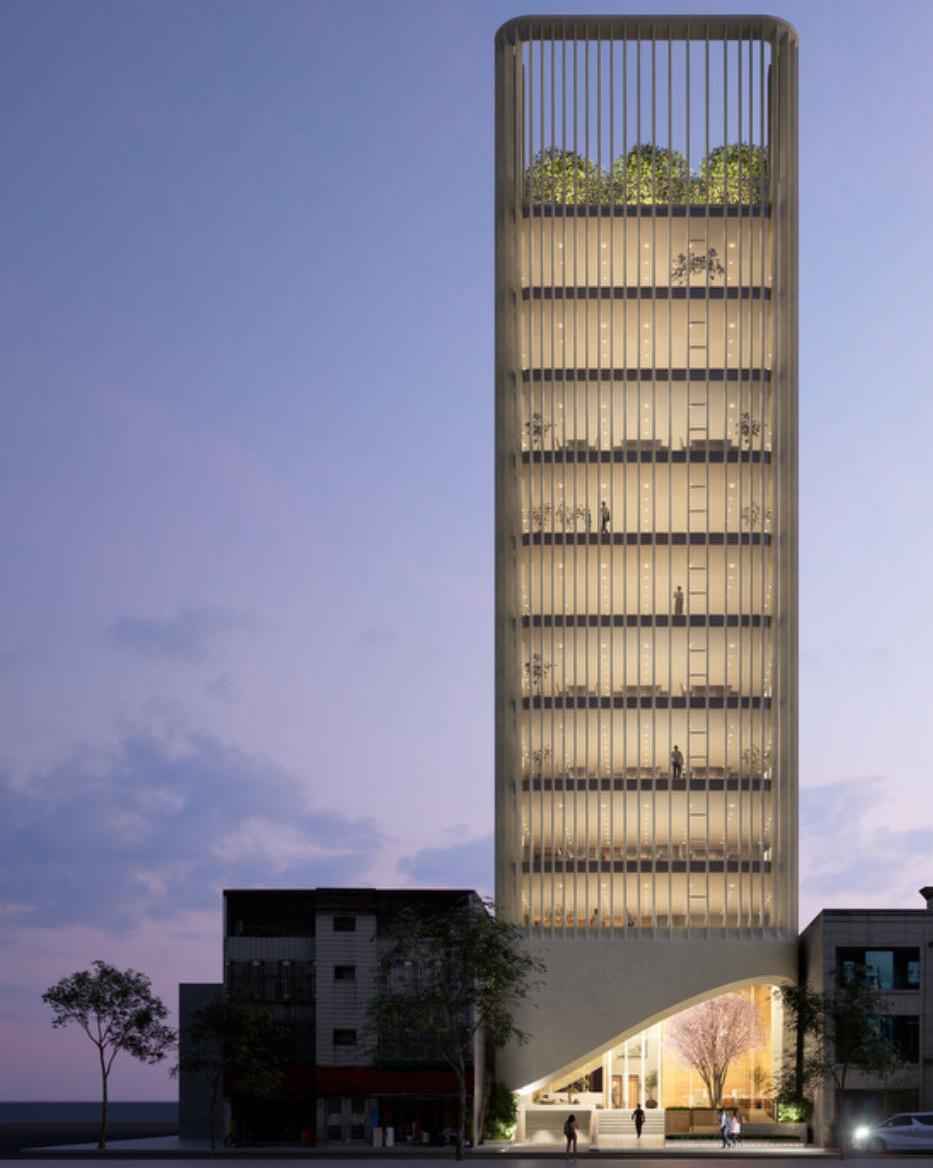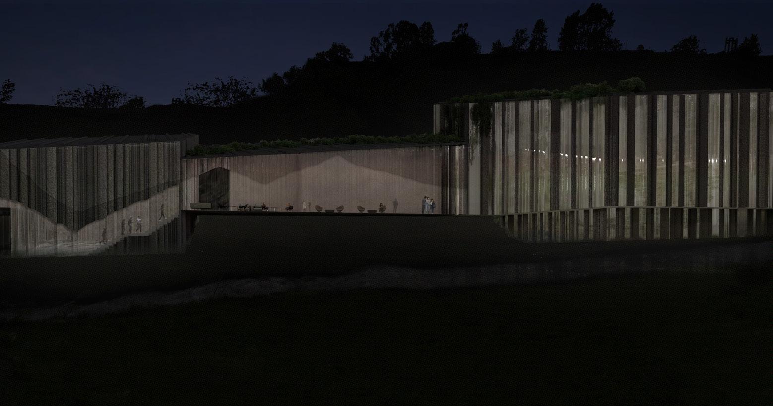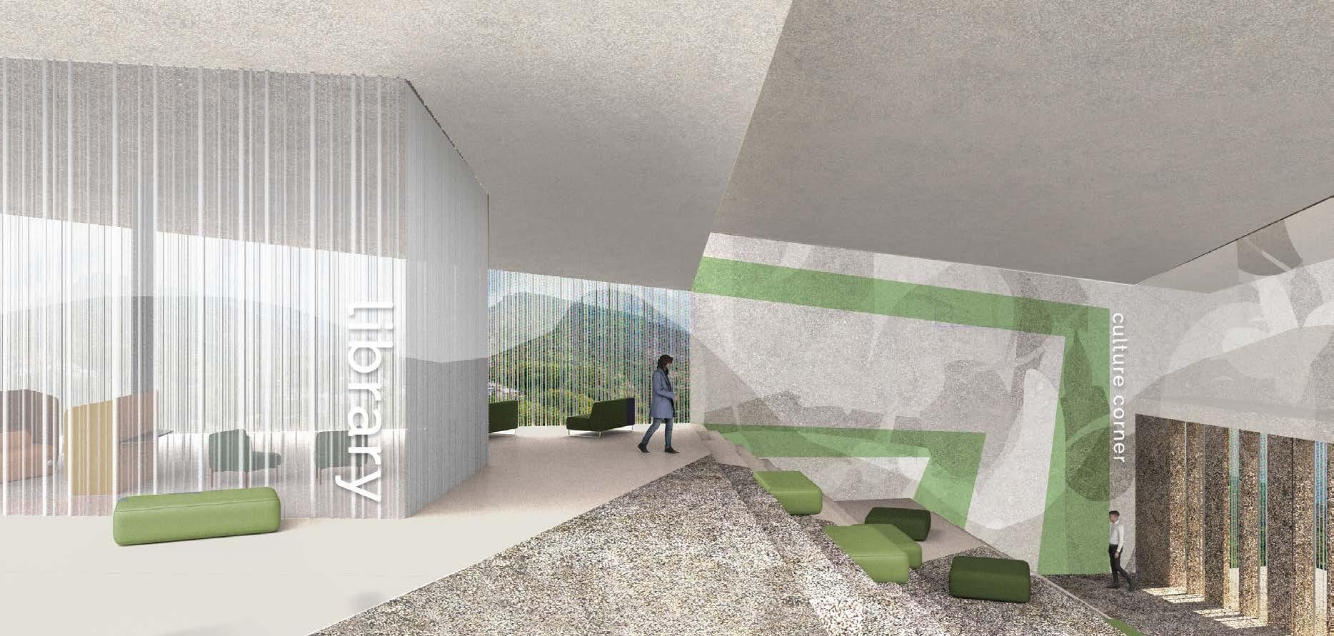 The elevations echo this rhythm through varied extrusions and a stepped roofline that integrates seamlessly with the urban fabric. Composite stone materials and green roofs blend the project into the natural backdrop while establishing it as an iconic landmark.