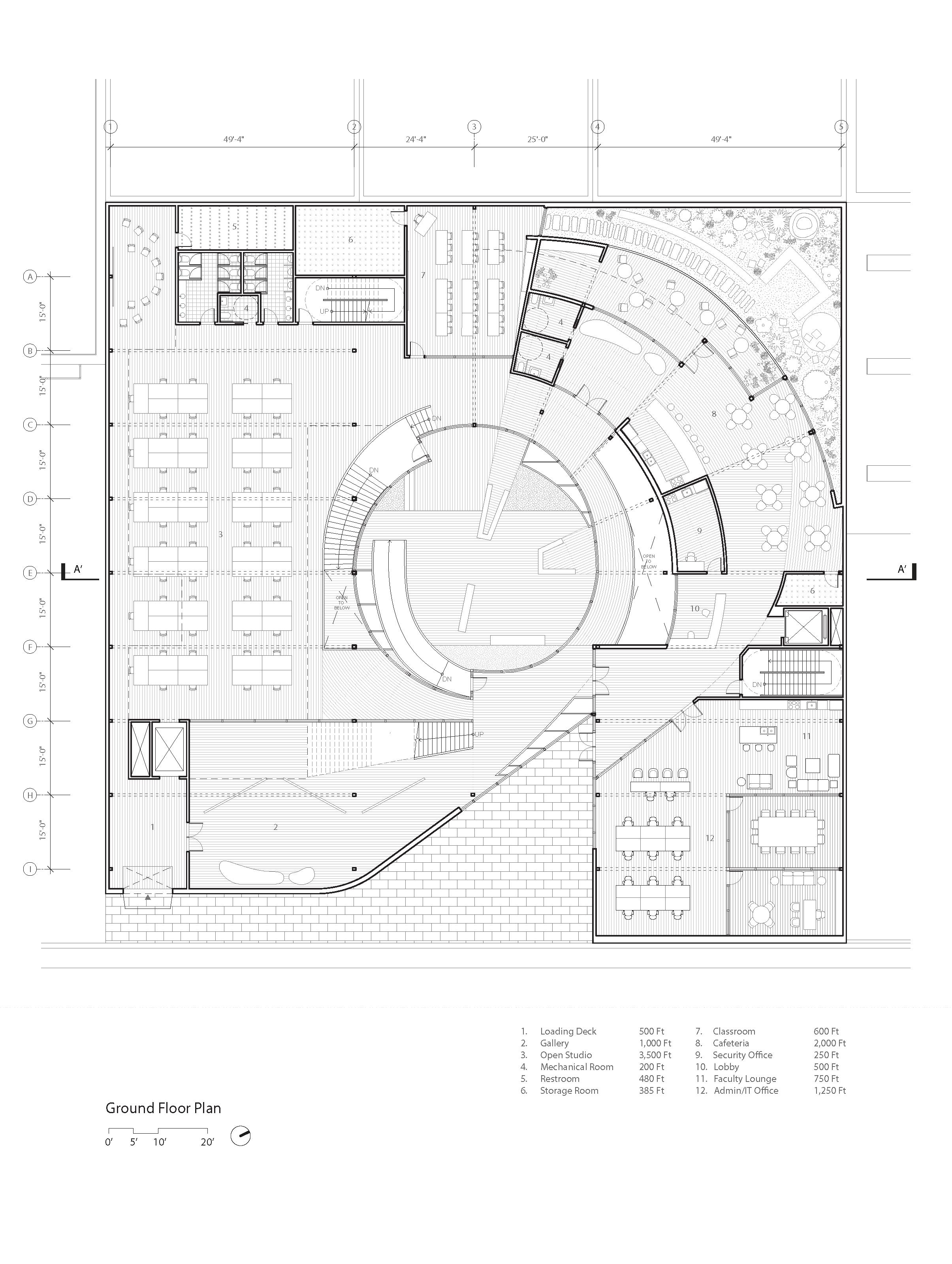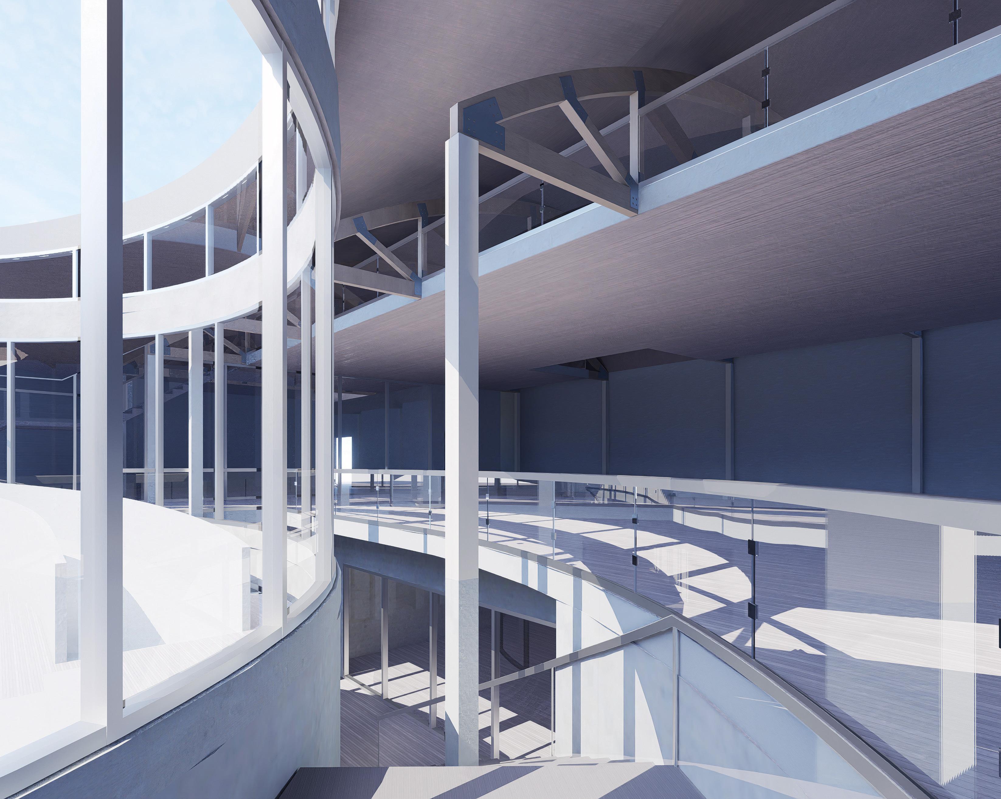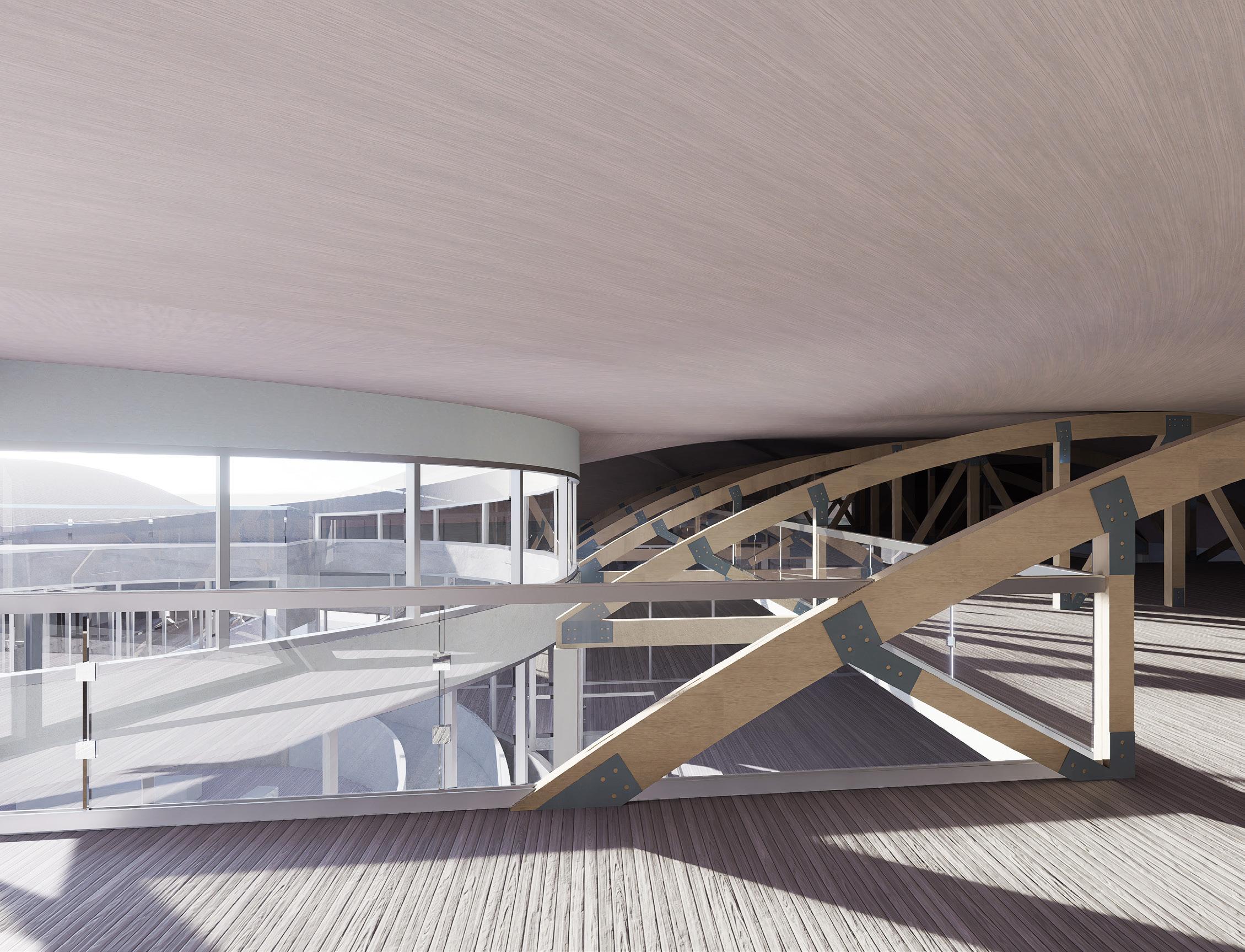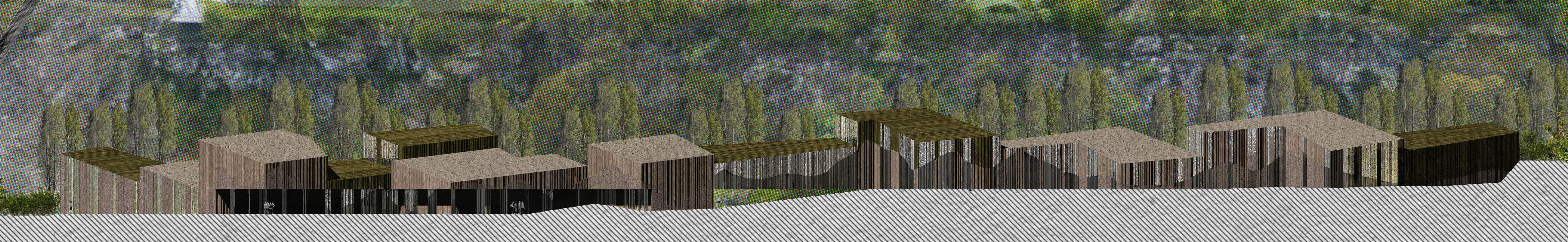 The boutique hotel anchors the northern end, while the educational complex follows a narrow strip along the river. This configuration inspires a stepped lenticular plan aligned with the city grid, creating a dynamic architectural presence. Externally, the stepped form conceals and reveals the building’s massing, while internally, it frames shifting views of the landscape. A central promenade threads the programmatic elements together, serving as circulation, gathering space, and exhibition hall.