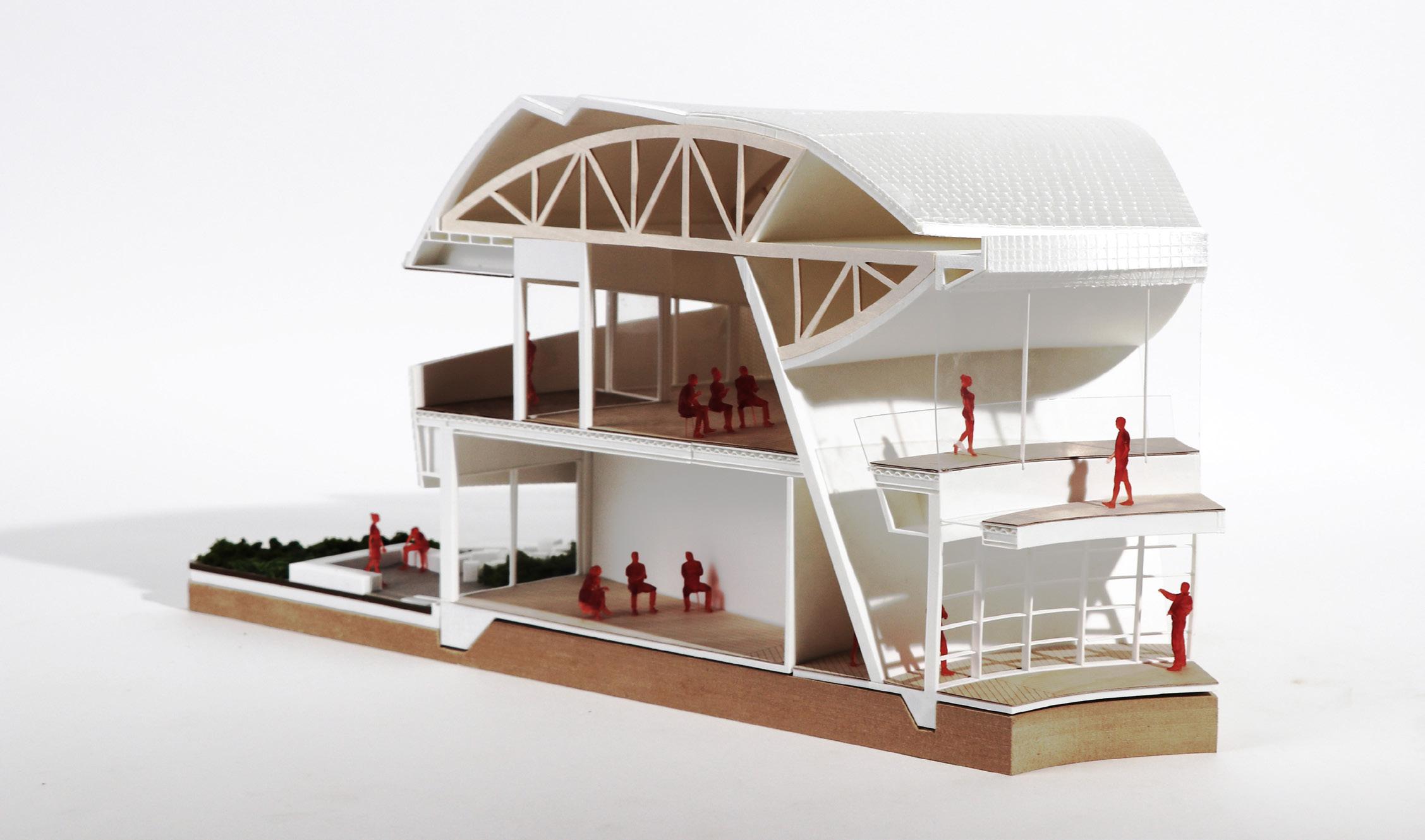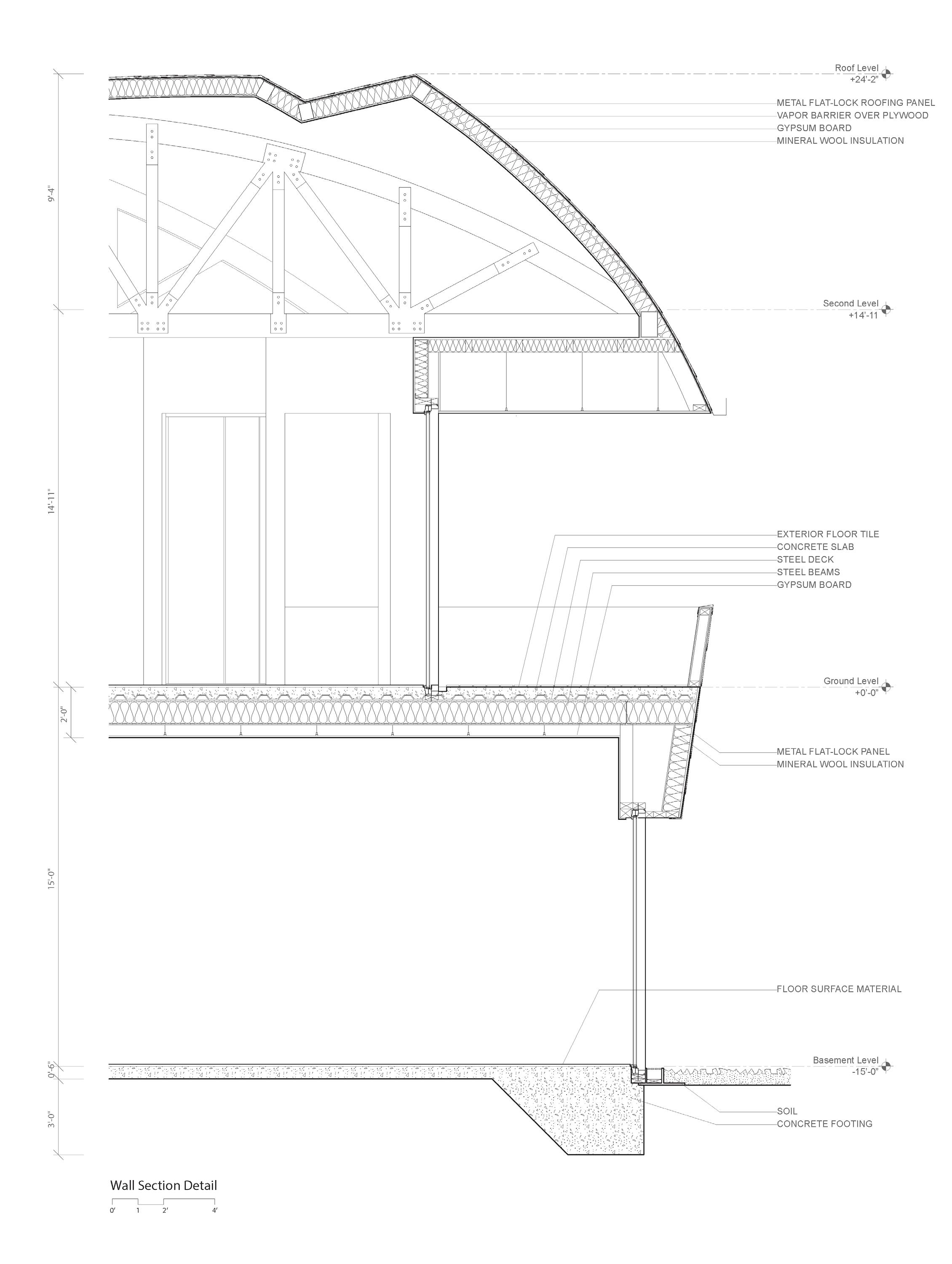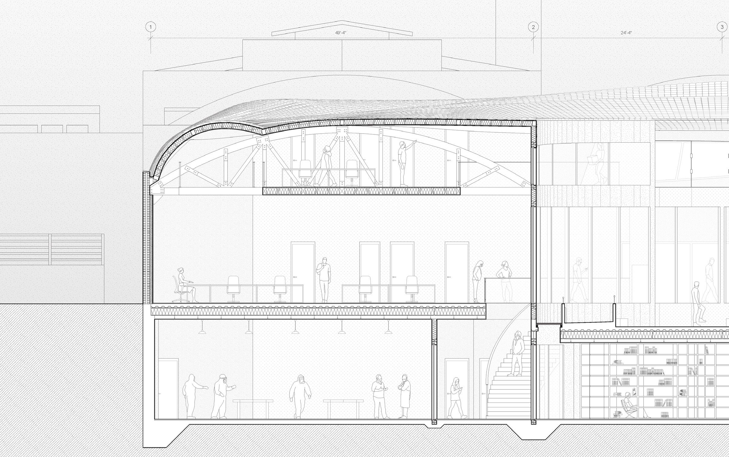 Modified truss profiles are initially used as outdoor terrace spaces and lighting devices, which are then transformed into a roof surface that peels off with hidden joists and structural HSS, creating an integrated system of trusses.