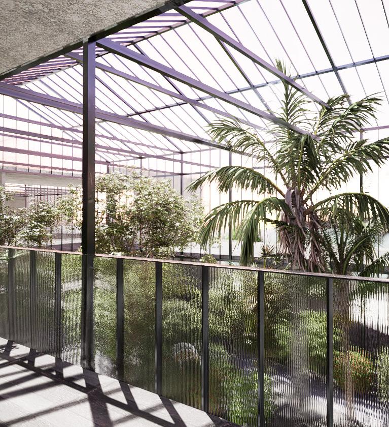 Arrangement Diagram - Encased by bars, the greenhouses are visible from every interior, connecting nature with the built environment.