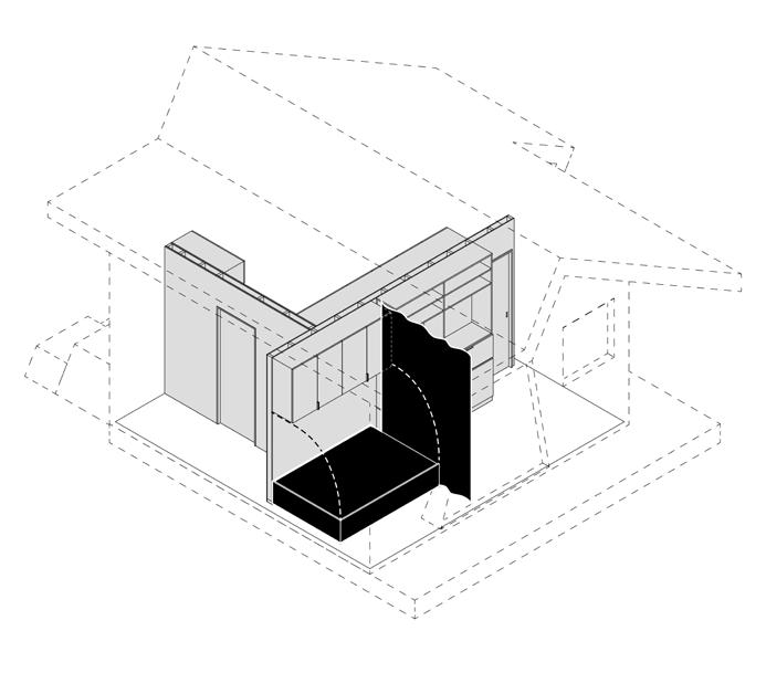 A transformable “L-Module” consolidates all domestic utilities — sleeping, hygiene, and storage — allowing the interior to expand for habitation or compress for commerce. No heavy machinery required; users reconfigure their environment entirely based on seasonal needs.