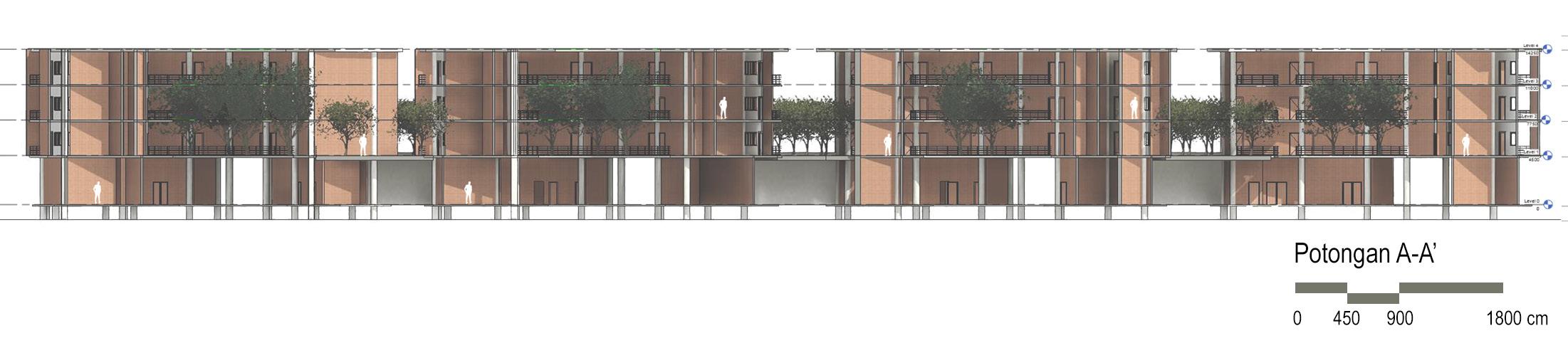 Adanya balkon yang tersusun akan membuat shading pada interior kamar. Ini merupakan bentuk respon akan paparan radiasi matahari.