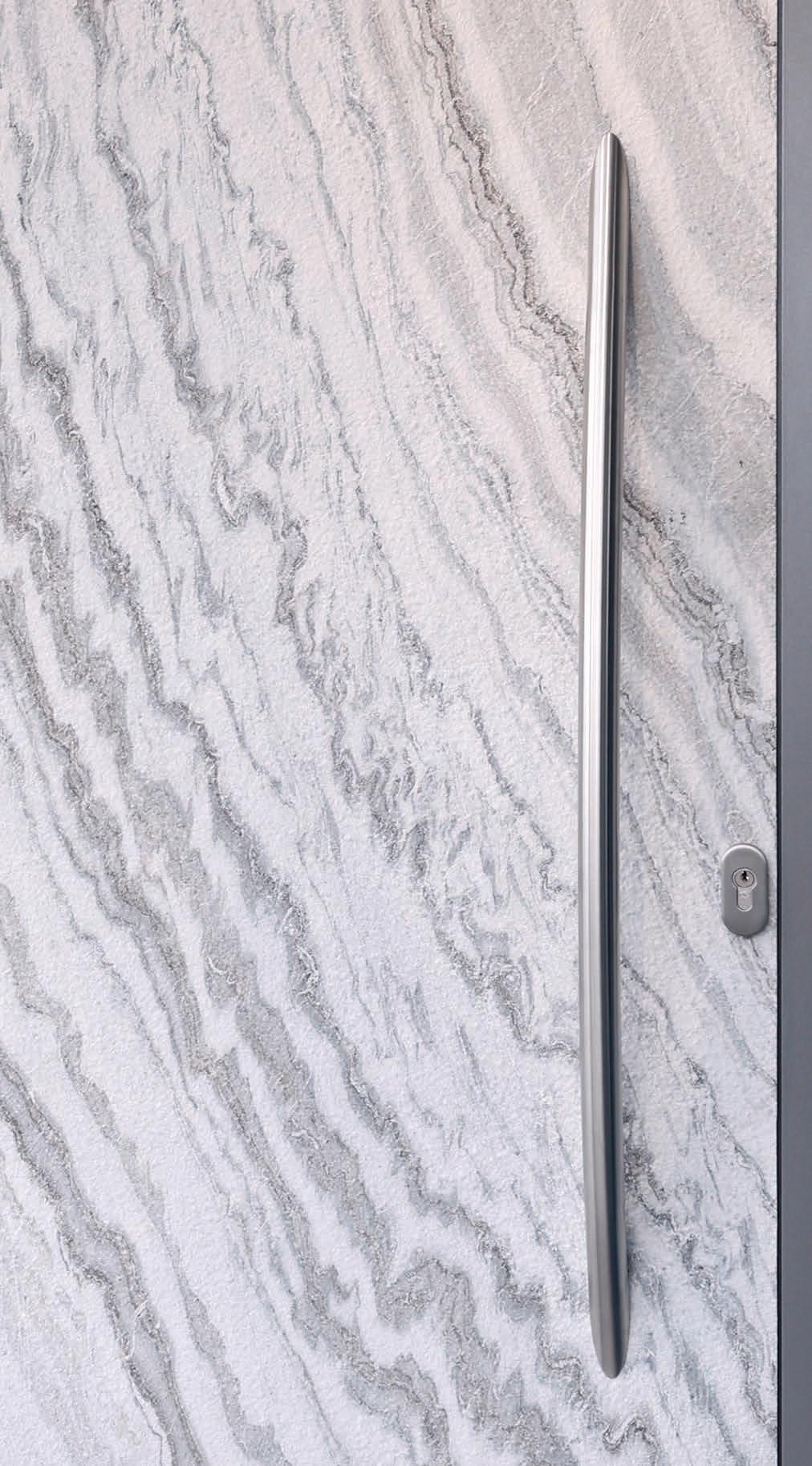 Lényege a letisztultságában rejlik, mindöszsze négy horizontális marási csík teremti meg a visszafogott eleganciát, ez a ritmusosság határozza meg az ajtó hangulatát.