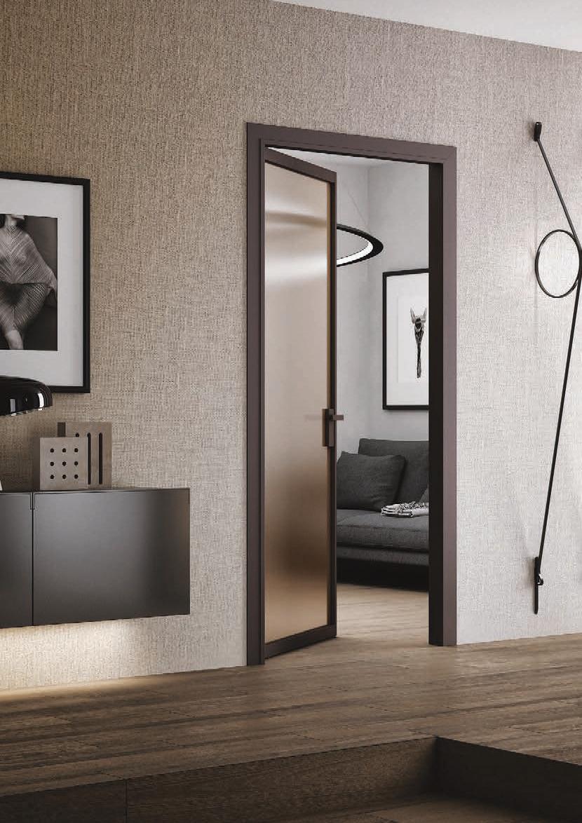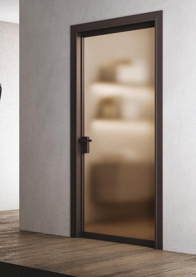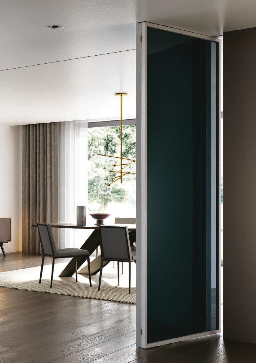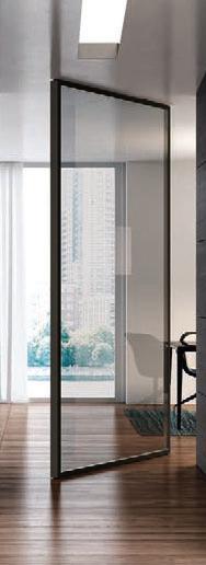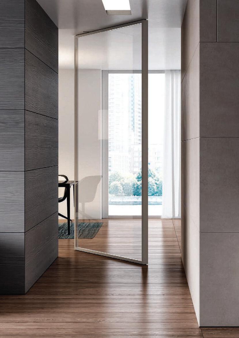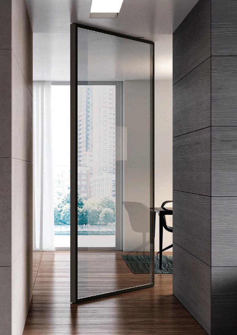 TWO-WAY VELA DOOR WITH PIVOT OPENINGPivot doors with aluminium structure, finshes: Brown, Antracite, Bianco and Argento. Safety glazing (tempered or laminated).