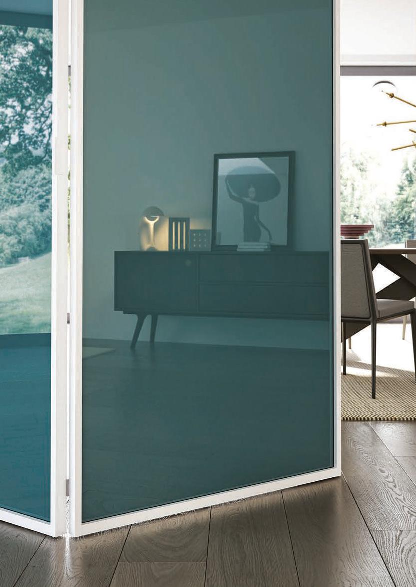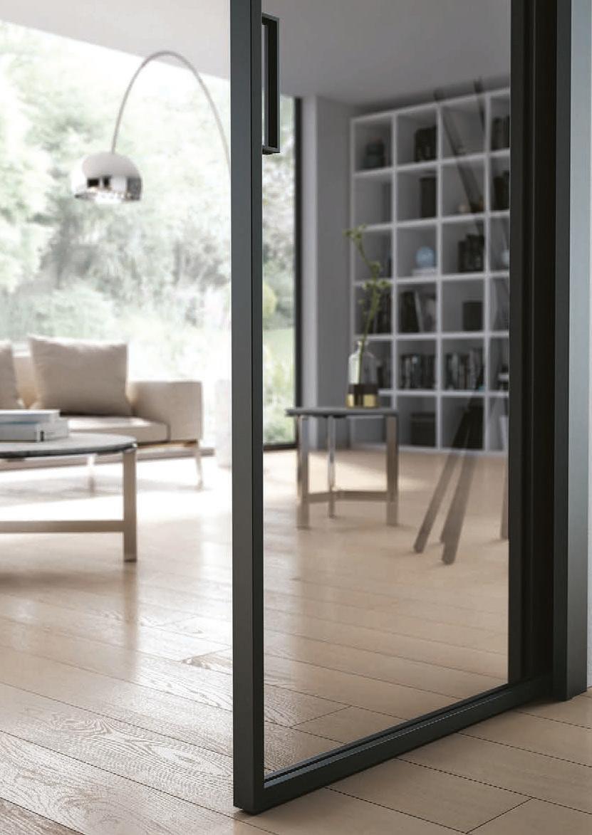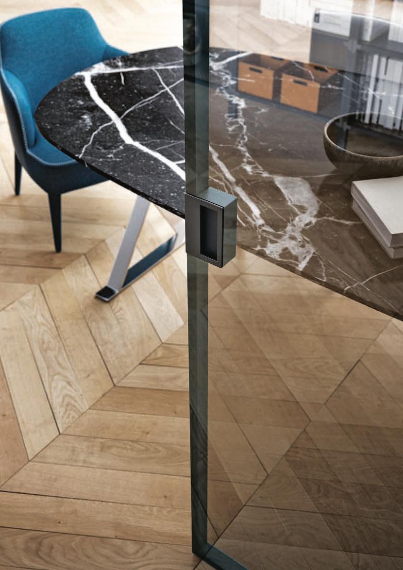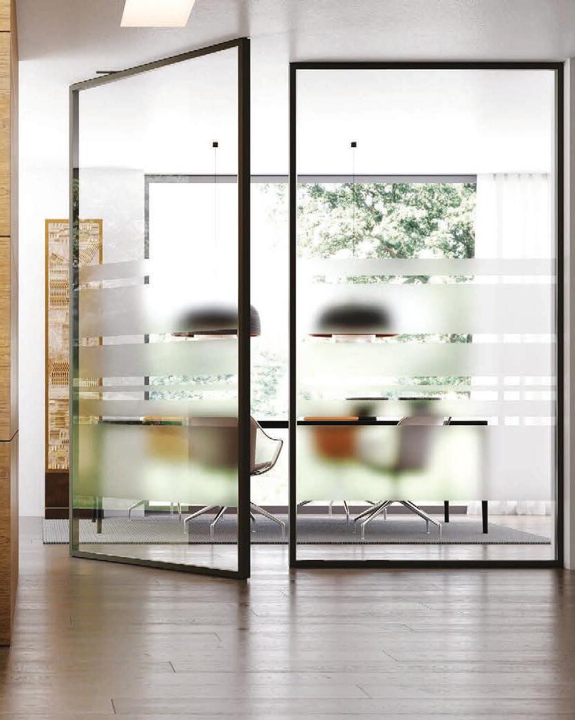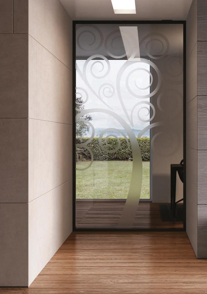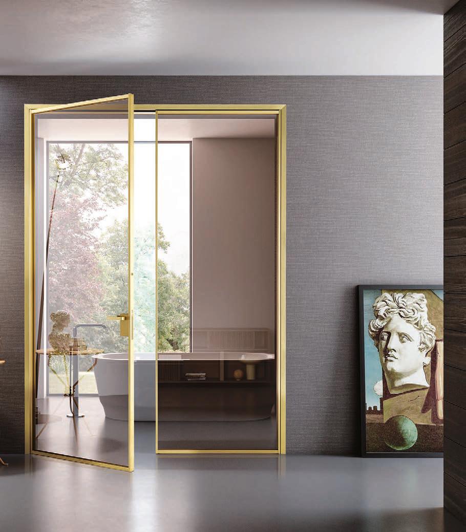 TWO-WAY VELA DOOR WITH PIVOT OPENINGPivot doors with aluminium structure, finshes: Brown, Antracite, Bianco and Argento. Safety glazing (tempered or laminated).