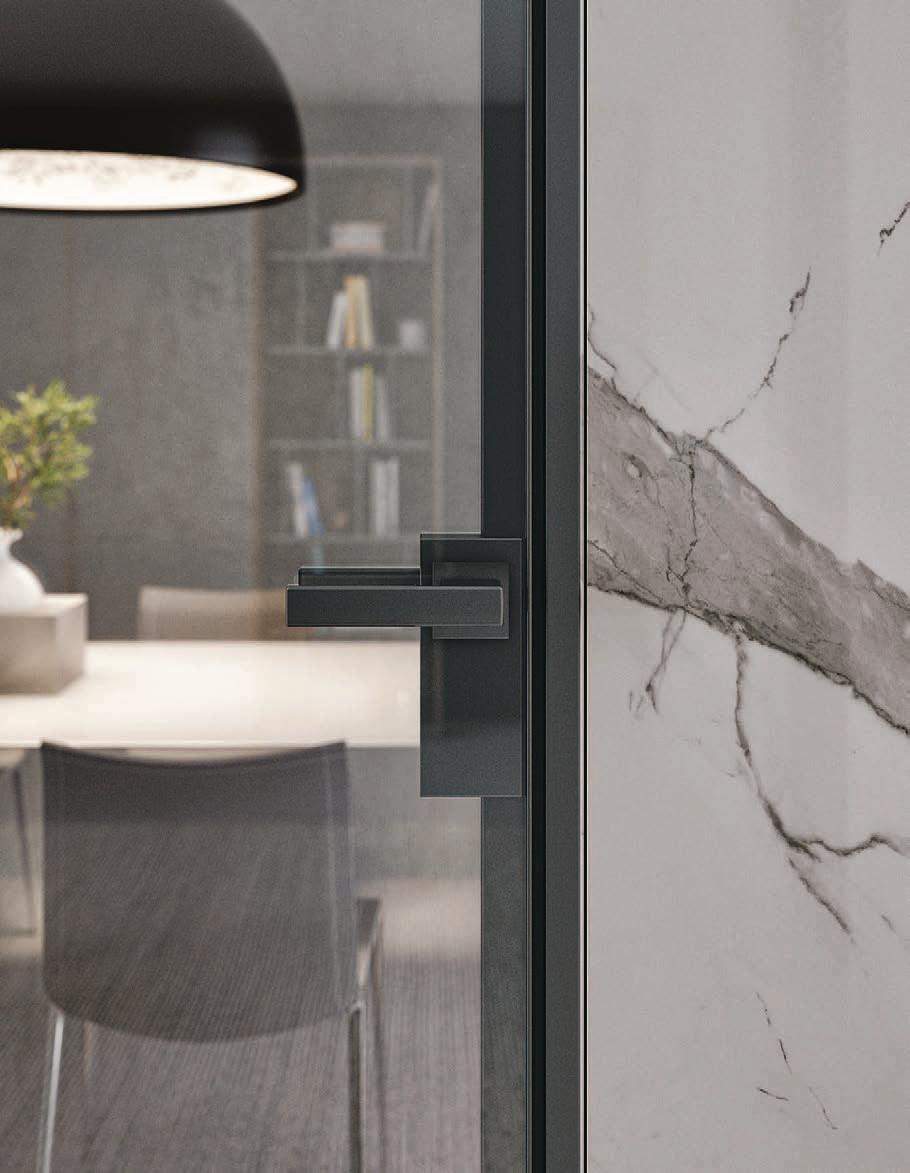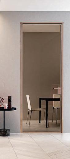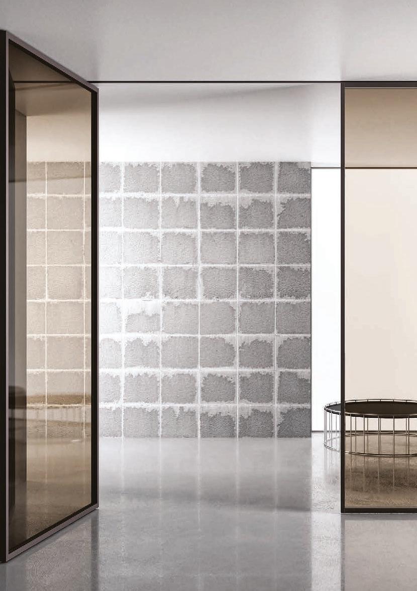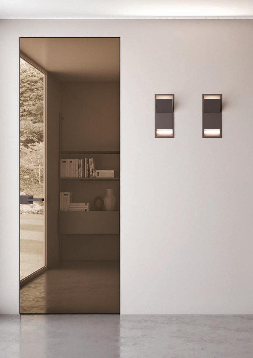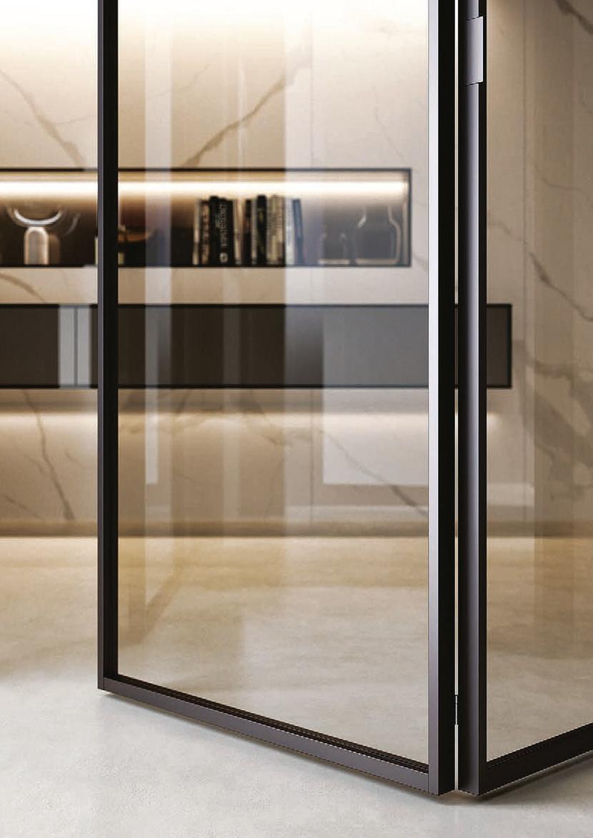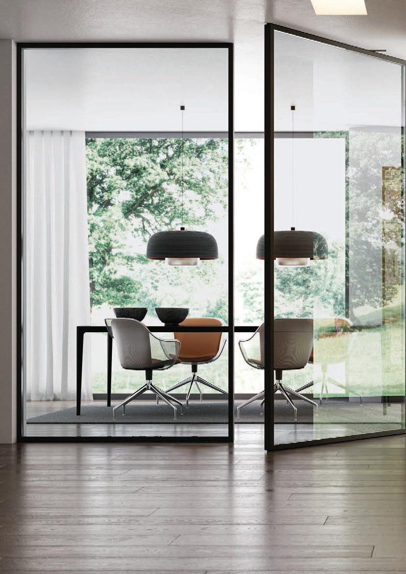 TWO-WAY VELA DOOR WITH PIVOT OPENINGPivot doors with aluminium structure, finshes: Brown, Antracite, Bianco and Argento. Safety glazing (tempered or laminated).