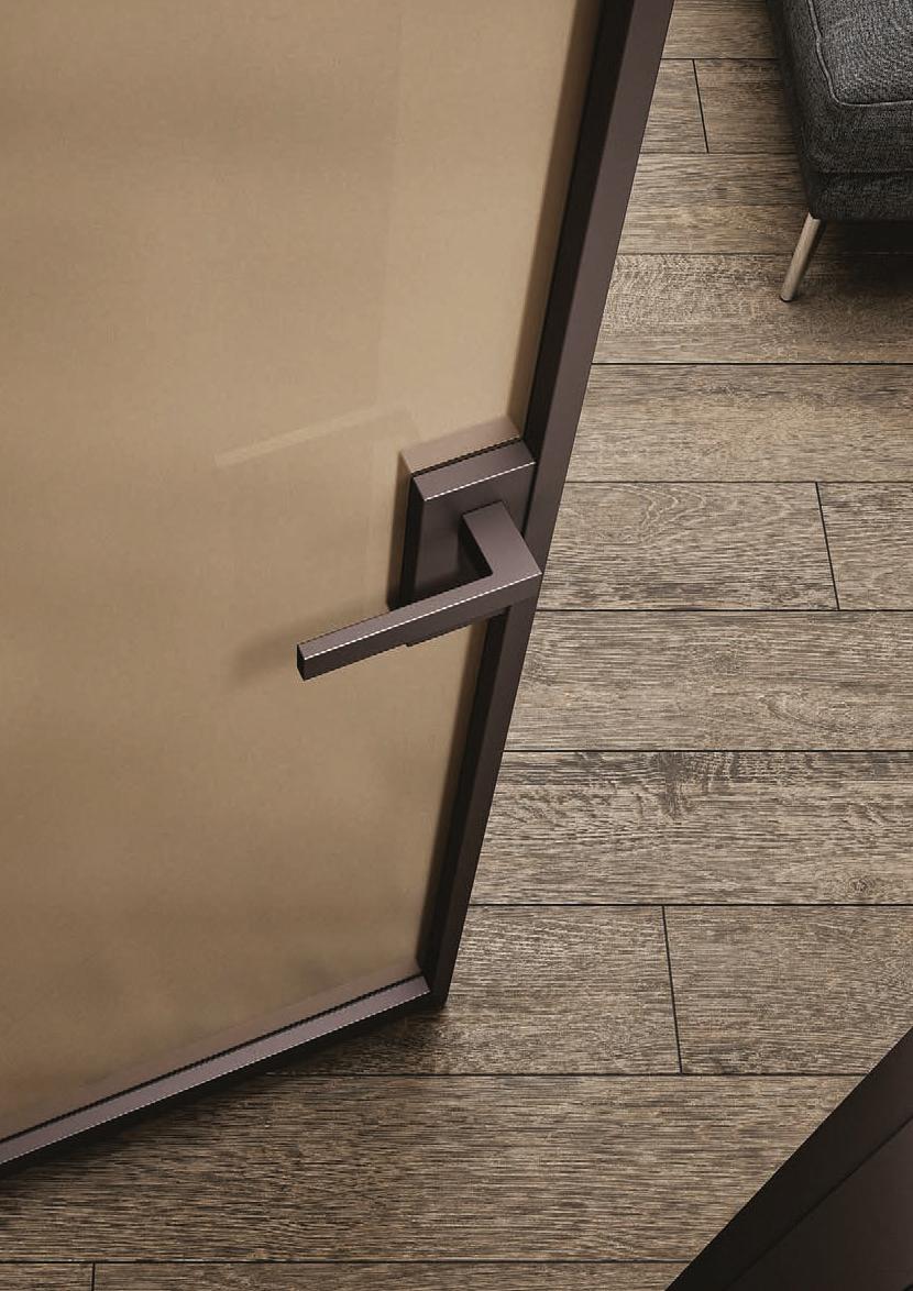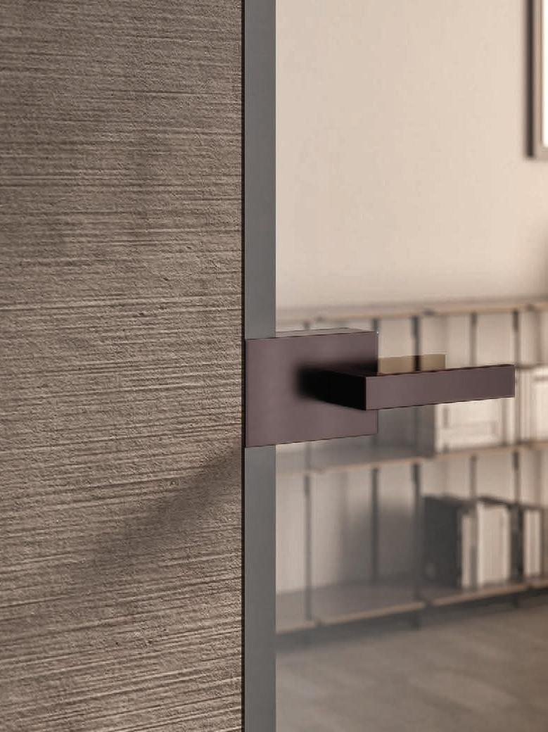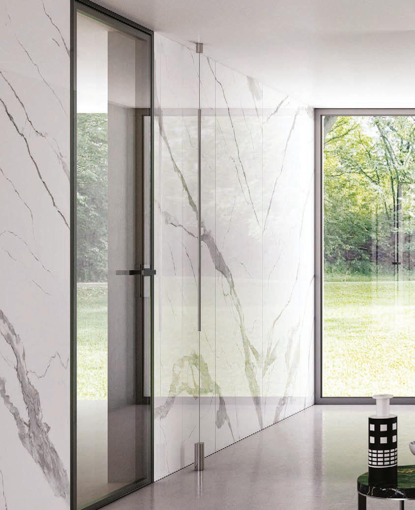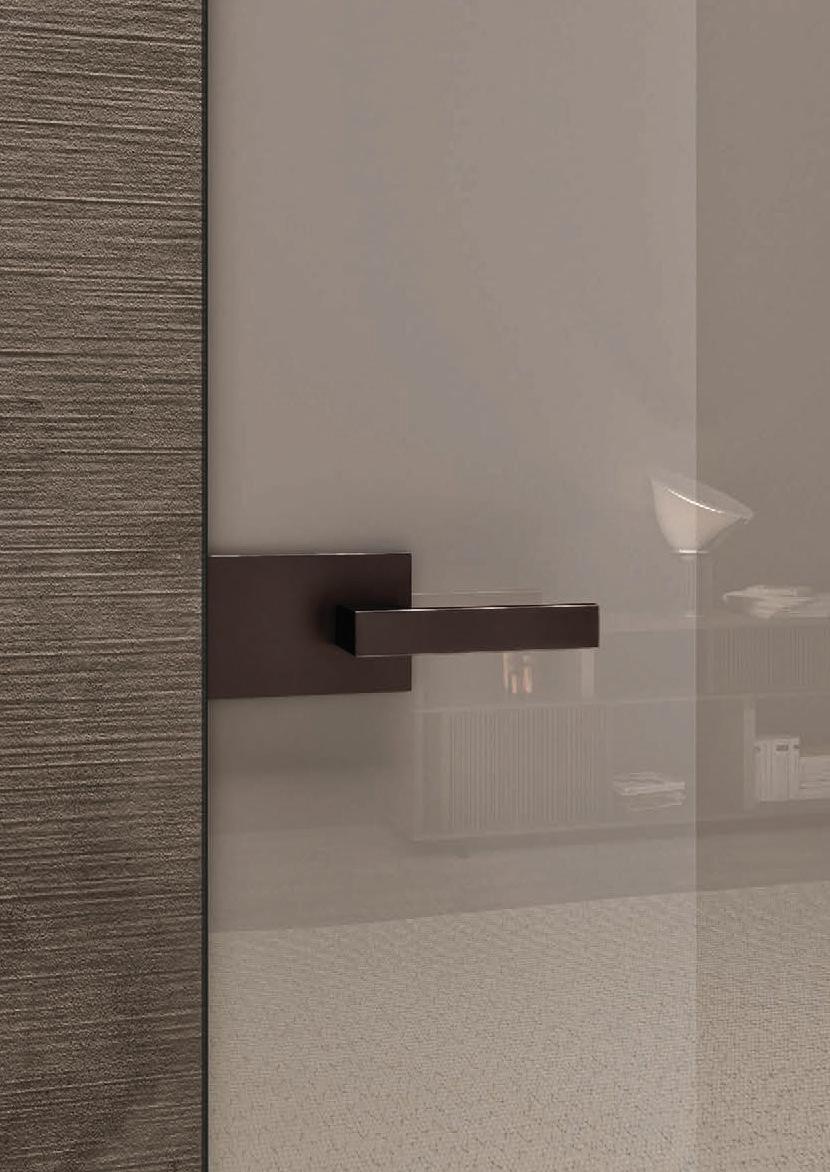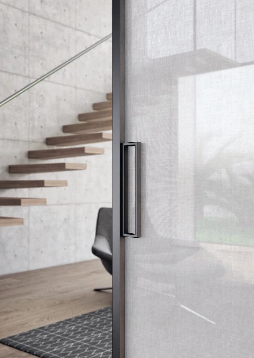 TWO-WAY VELA DOOR WITH PIVOT OPENINGPivot doors with aluminium structure, finshes: Brown, Antracite, Bianco and Argento. Safety glazing (tempered or laminated).
