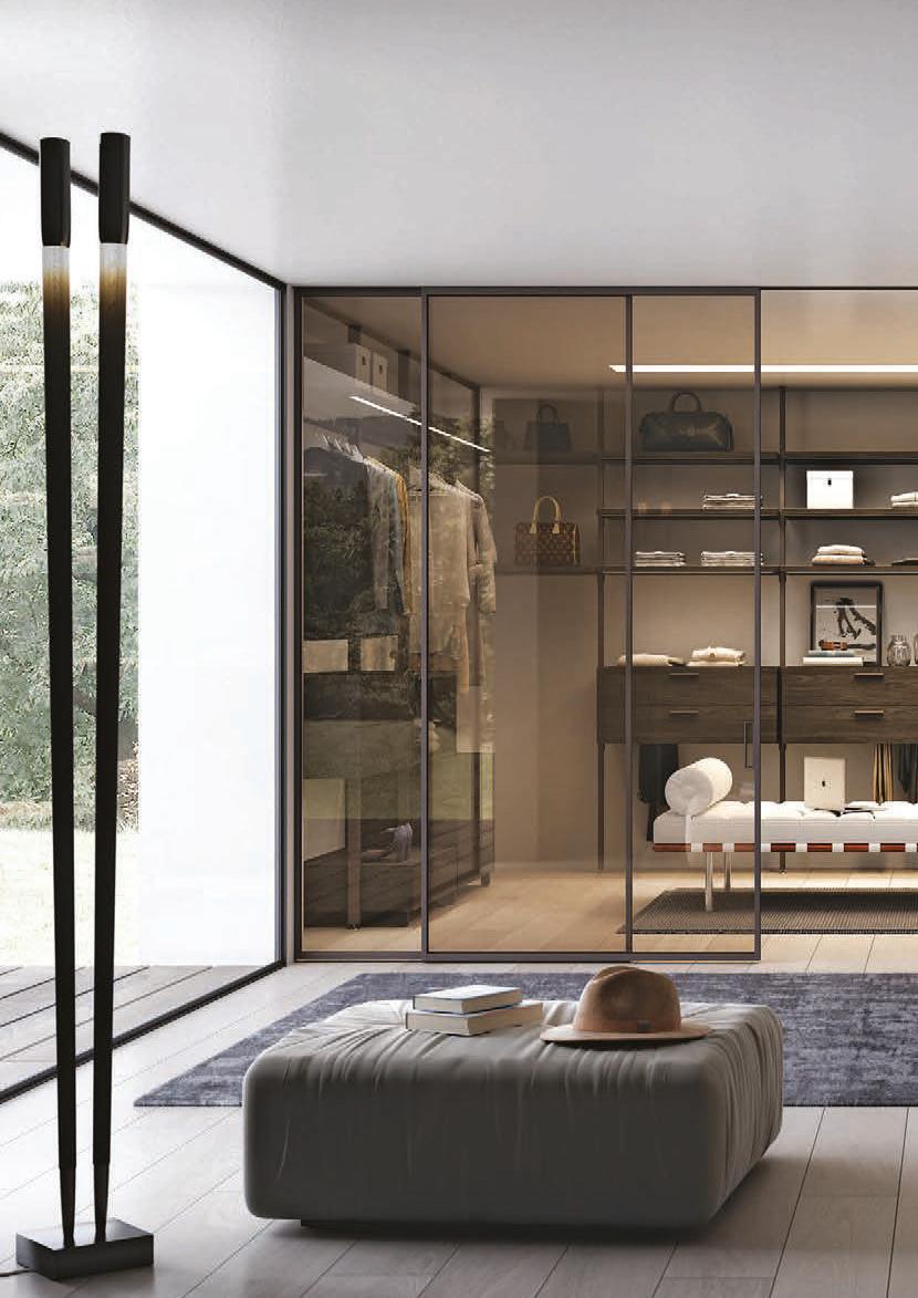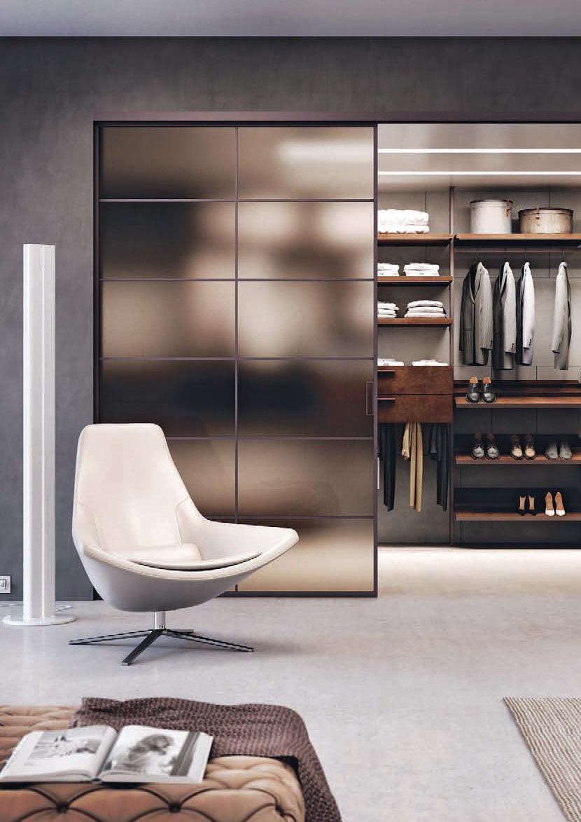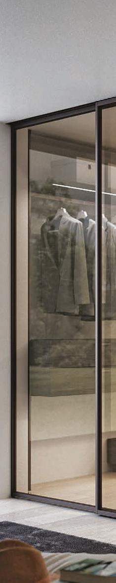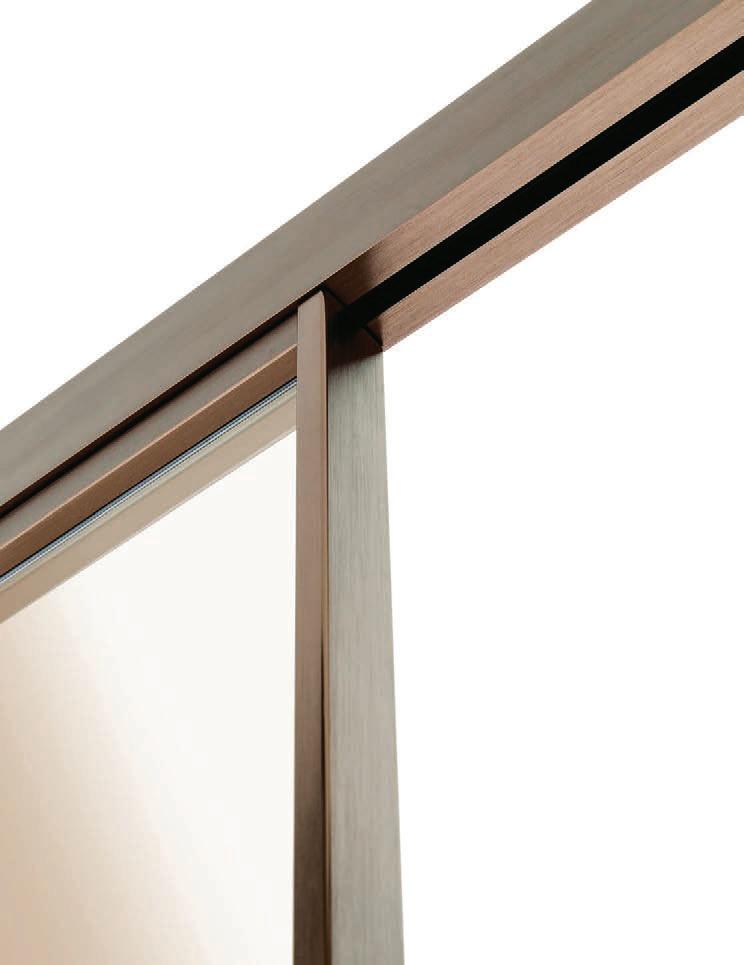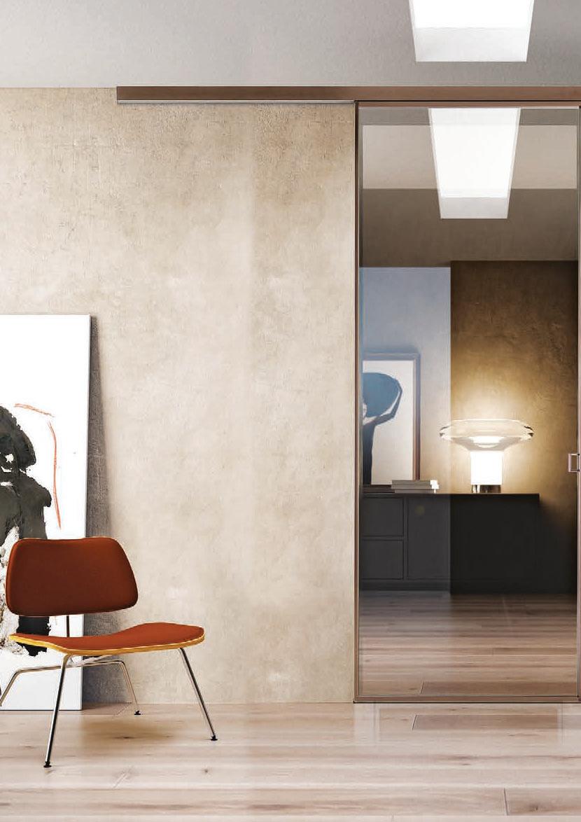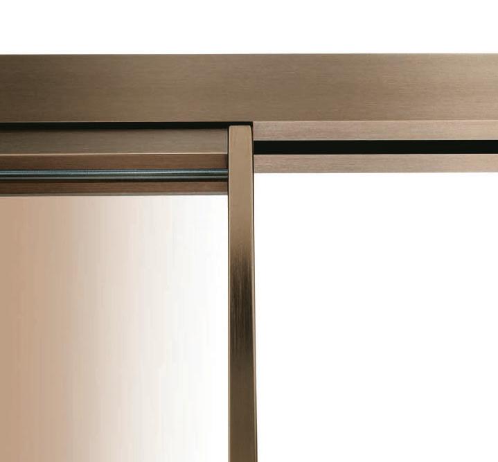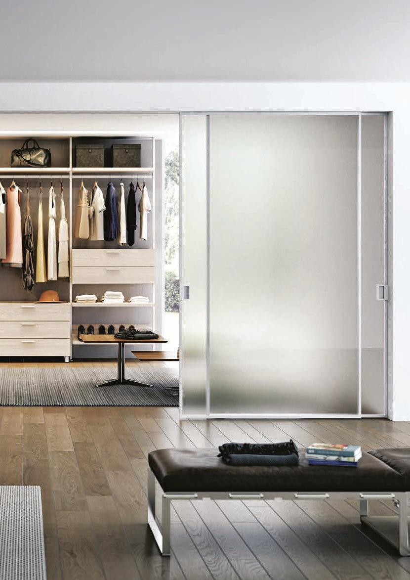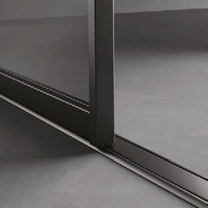 Sistema scorrevole con binario a terra, realizzato su misura. Le ante hanno struttura in alluminio e tamponamenti sia con pannelli pieni, sia con vetri di sicurezza (temperati o stratificati). Rolling System è costituito da una trave superiore scatolare estrusa in un unico profilo di alluminio, da fissare a parete o a soffitto e presenta un binario guida a terra. Made-to-measure sliding system with floor rail. The doors feature an aluminium structure and side panelling using either solid panels or safety glazing (tempered or laminated). The Rolling System consists of an upper extruded boxed beam in a single aluminium casing, to be fastened to the wall or ceiling, and an embedded floor rail.