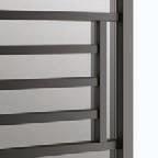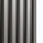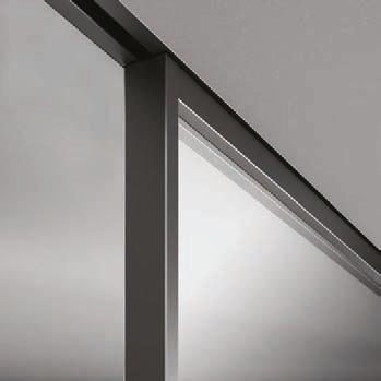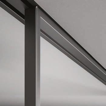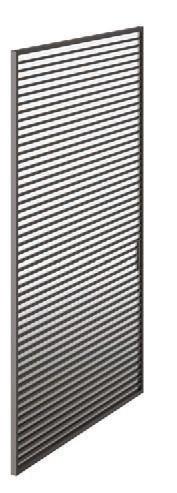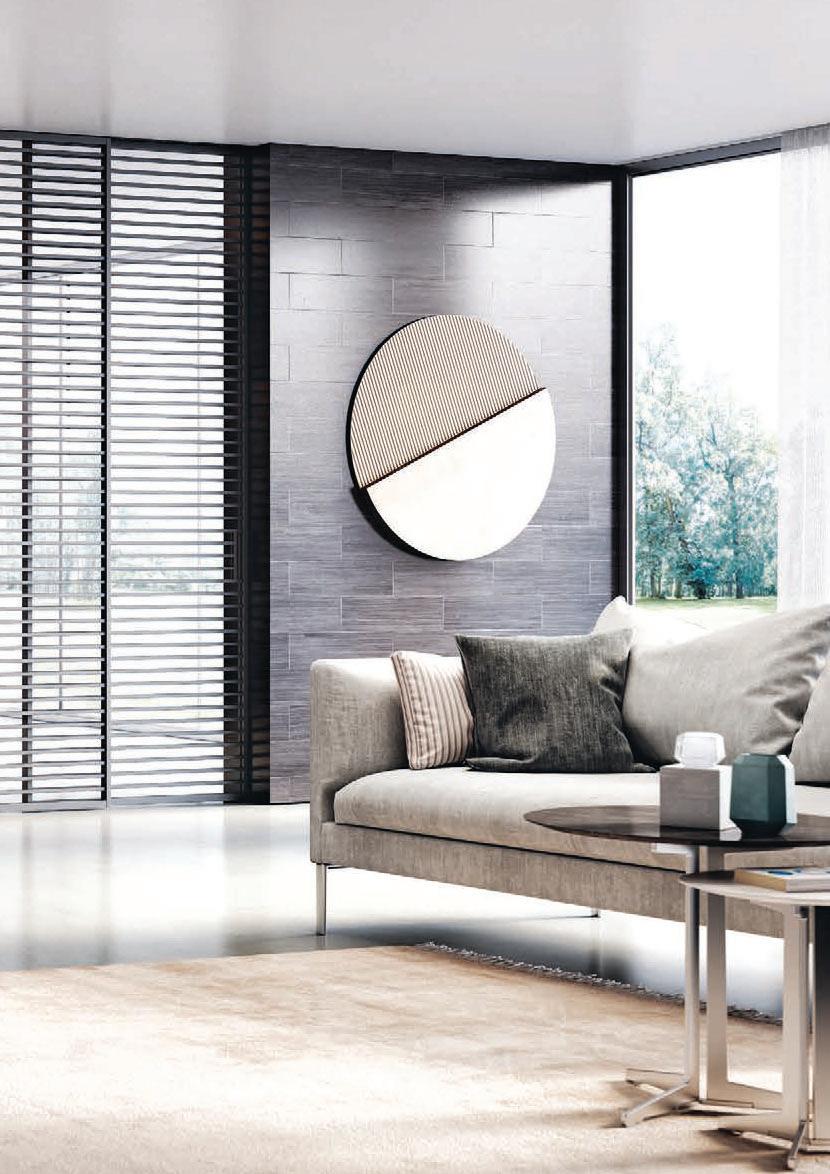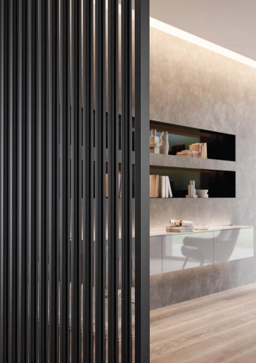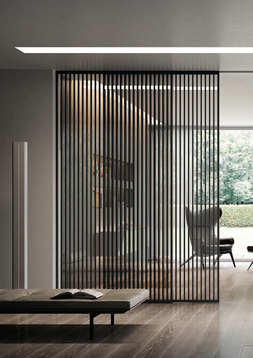 presenta una struttura importante realizzata in alluminio finitura Antracite, Brown, Bianco e Argento. La fitta trama verticale dei listelli crea un “frame” effetto parete compatta, ma leggera. / A concept that recalls the kinetic art of the seventies. Plana Kansas has a bold aluminium structure available in the finishes Antracite, Brown, Bianco and Argento. The dense vertical strips texture creates a “frame” with an effect of a solid but light wall.