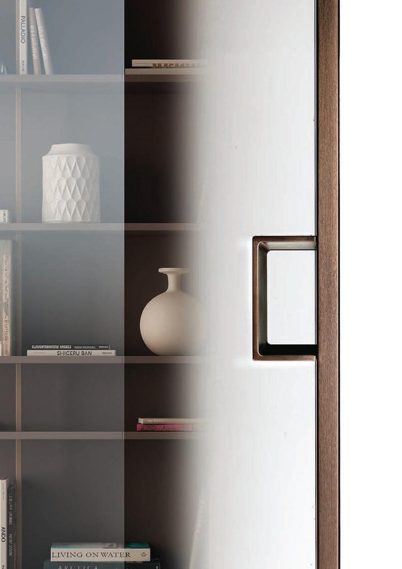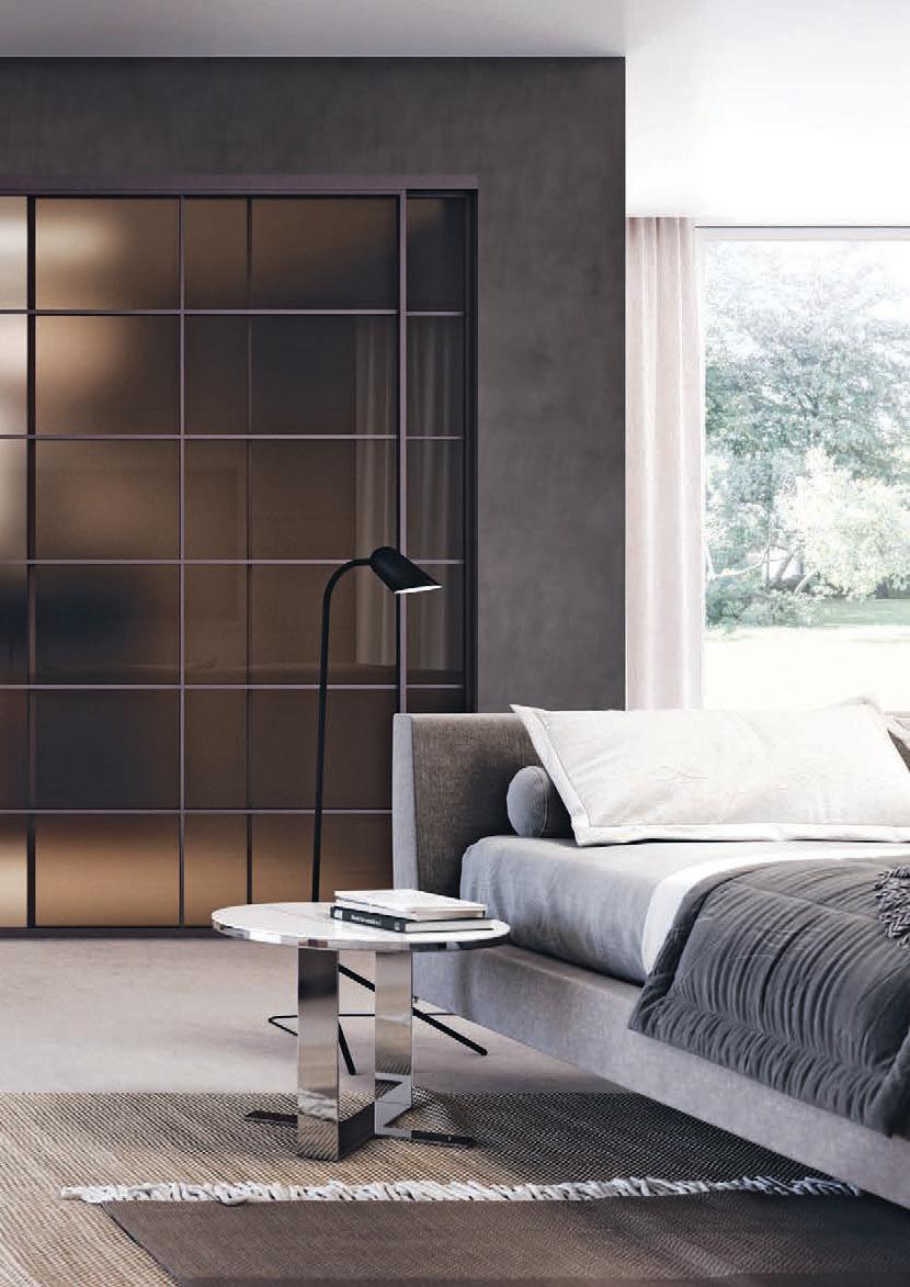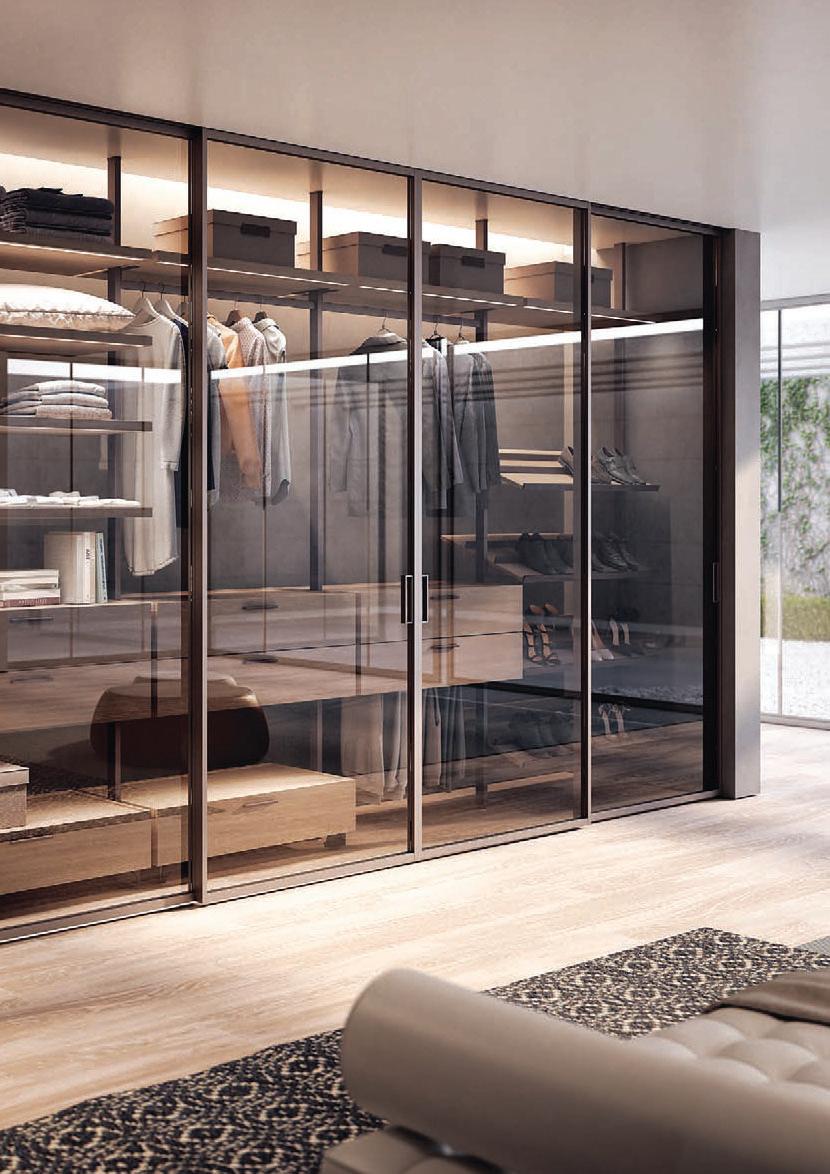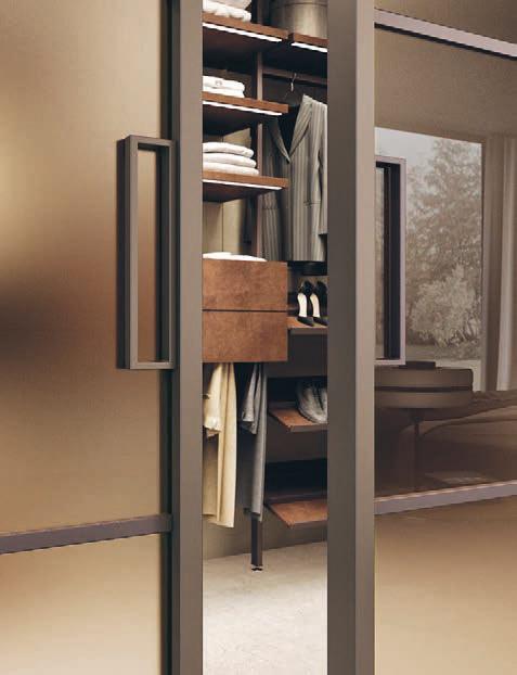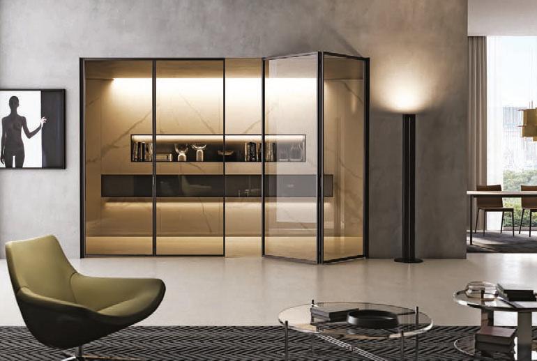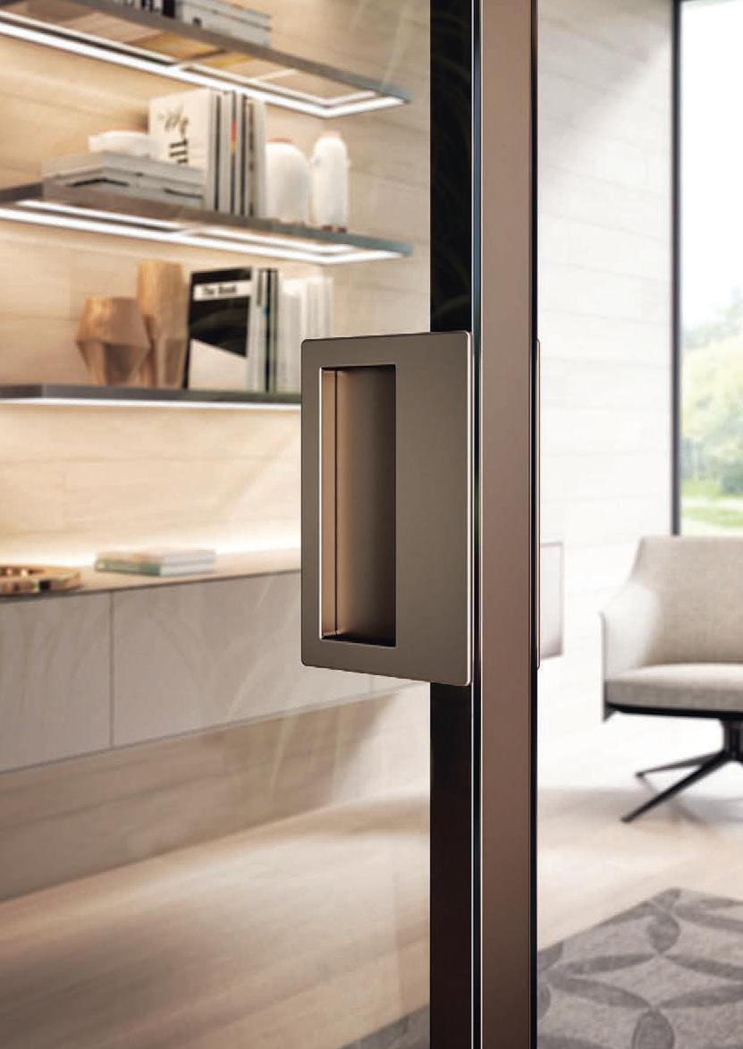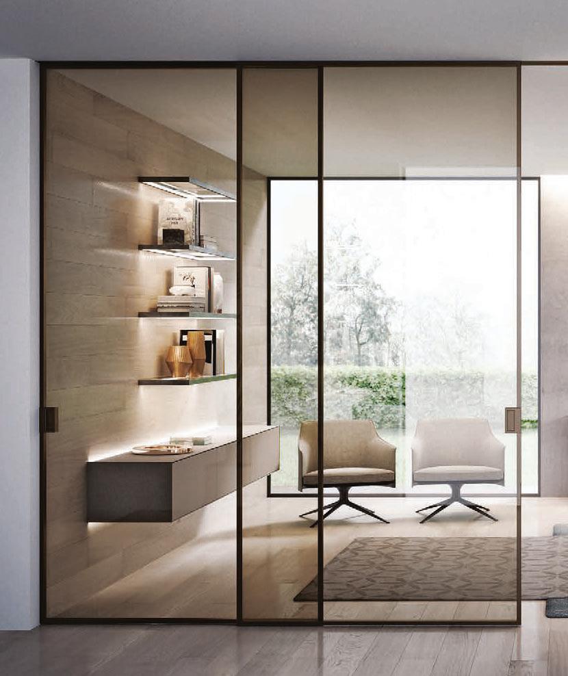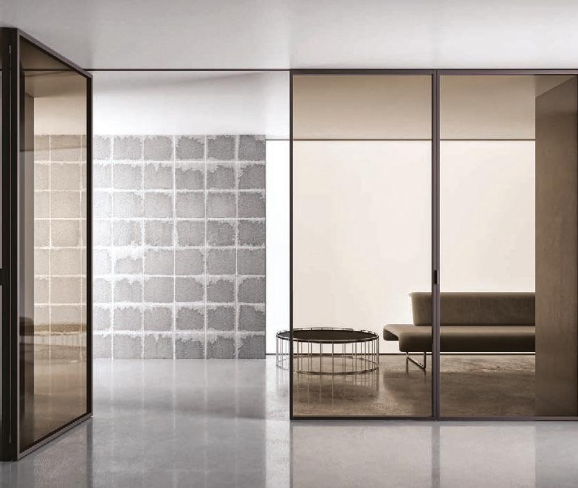 Plana System con binario a incasso, porte divisionali scorrevoli Crystal BI struttura alluminio finitura Brown, cristallo Trasparente Bronzo, maniglia Link a incasso. / Plana System with recessed tracks, Crystal BI sliding divider doors, Brown finish aluminum frame, Trasparente Bronzo glass, recessed Link handle.