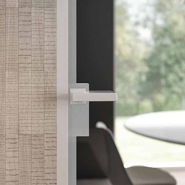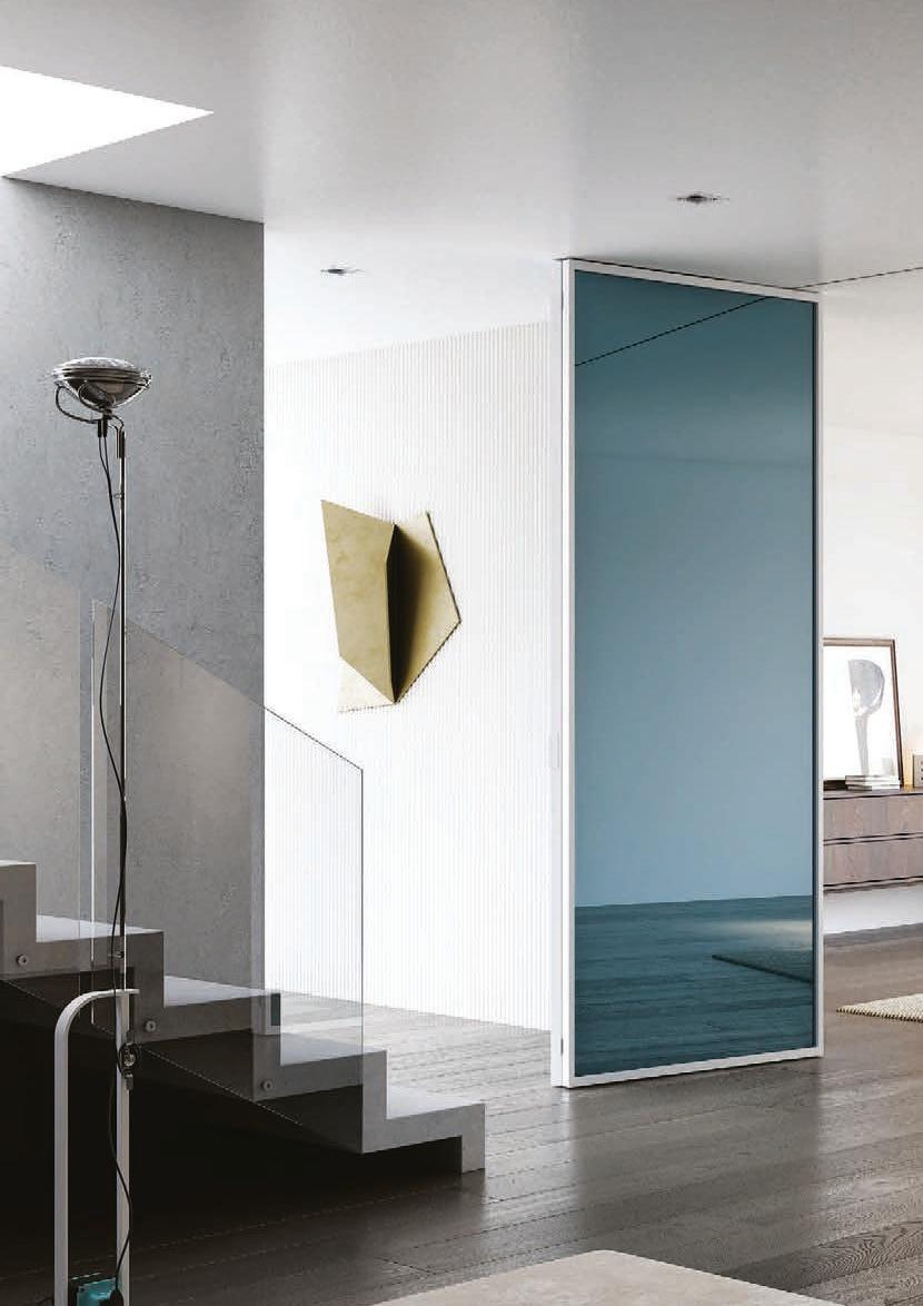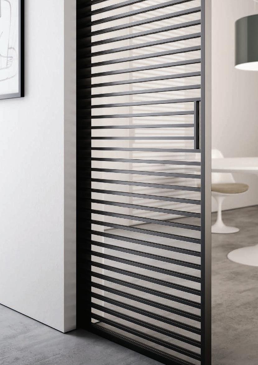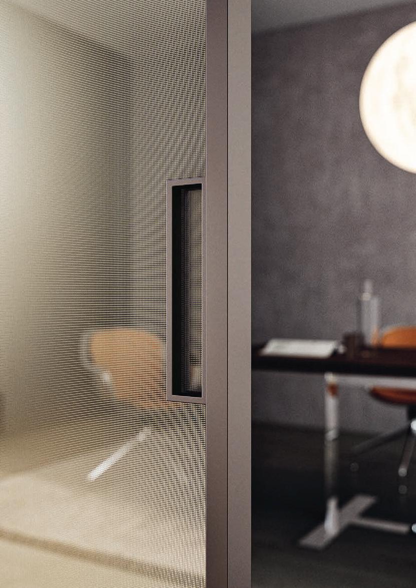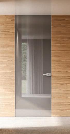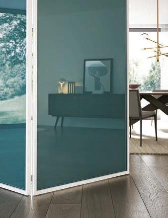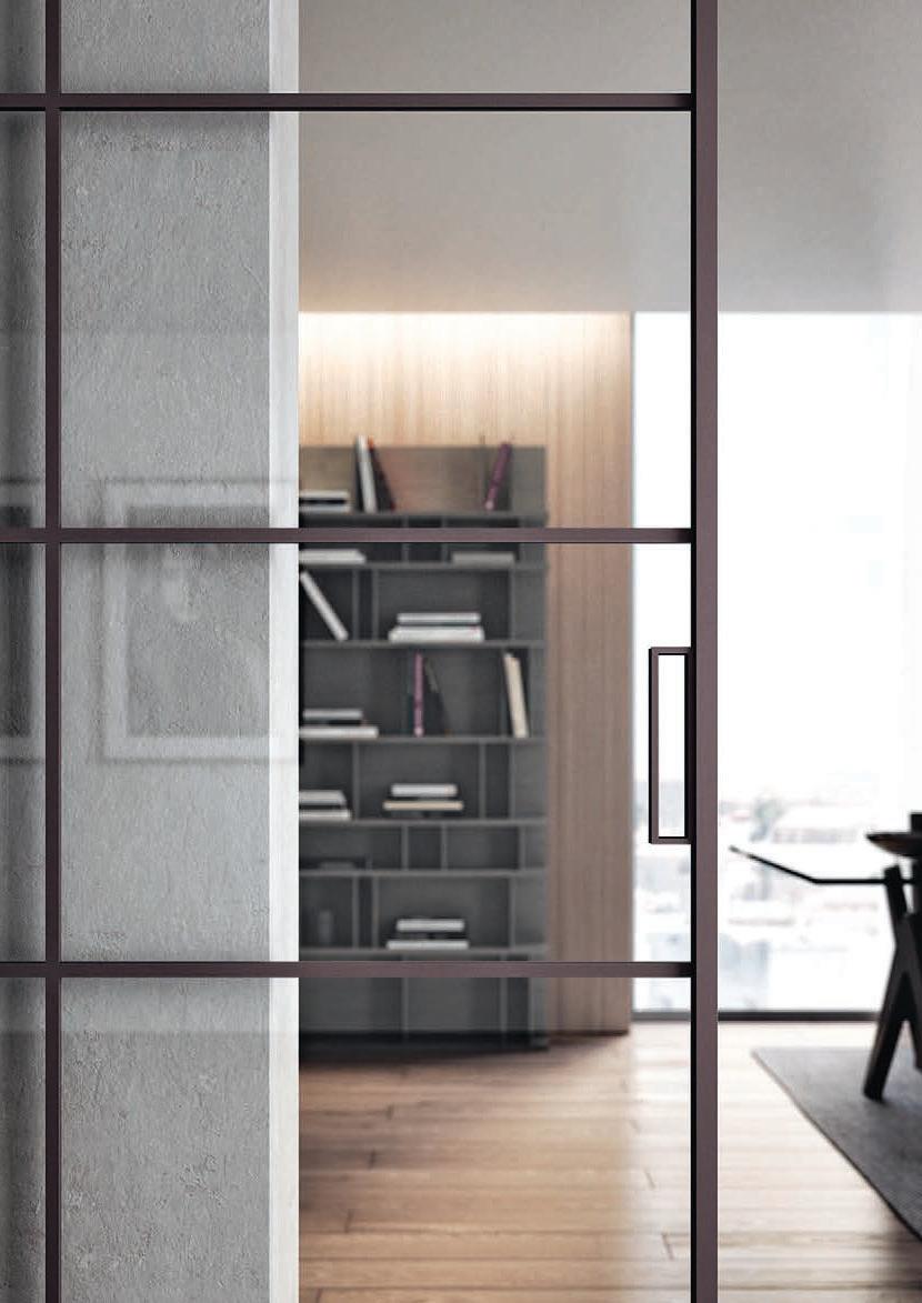 Filomuro flush doors can be installed in hinged or pocket versions, made-to-measure and floor-to-ceiling. Visible aluminium structure, door leaf available in different materials: wood, glass or laminate.
