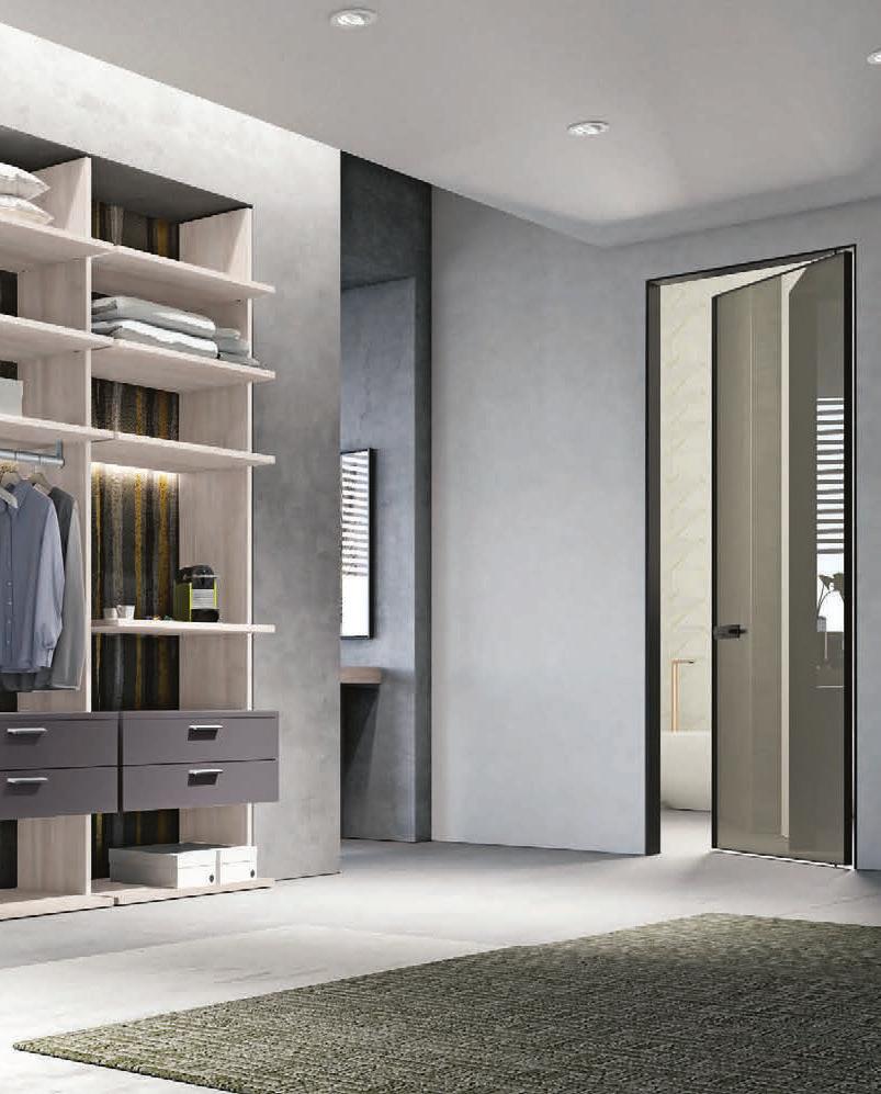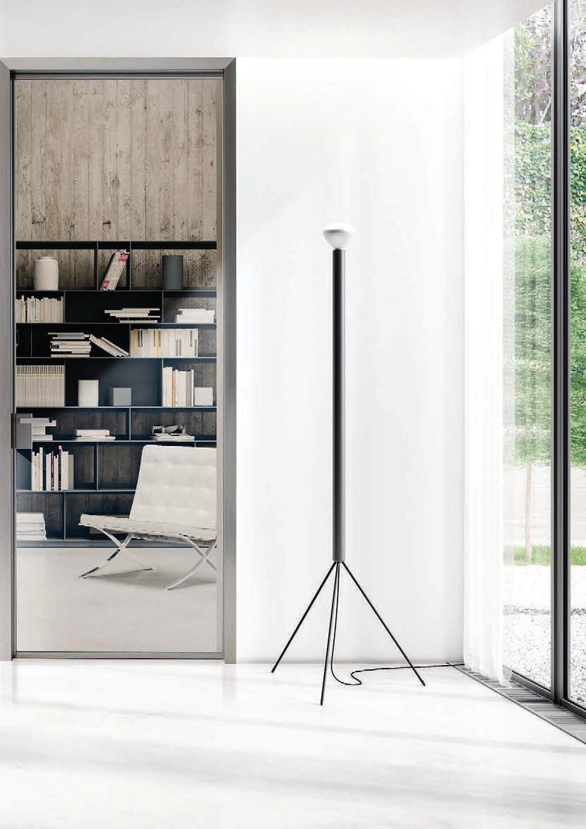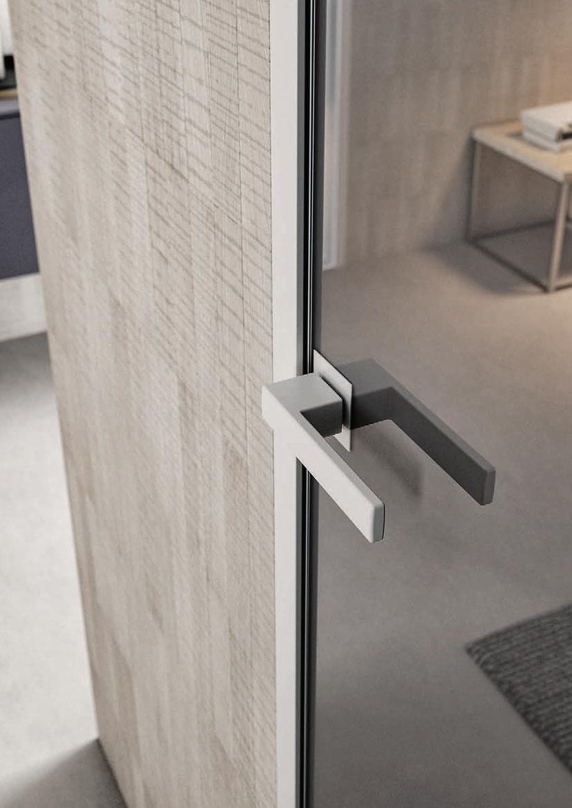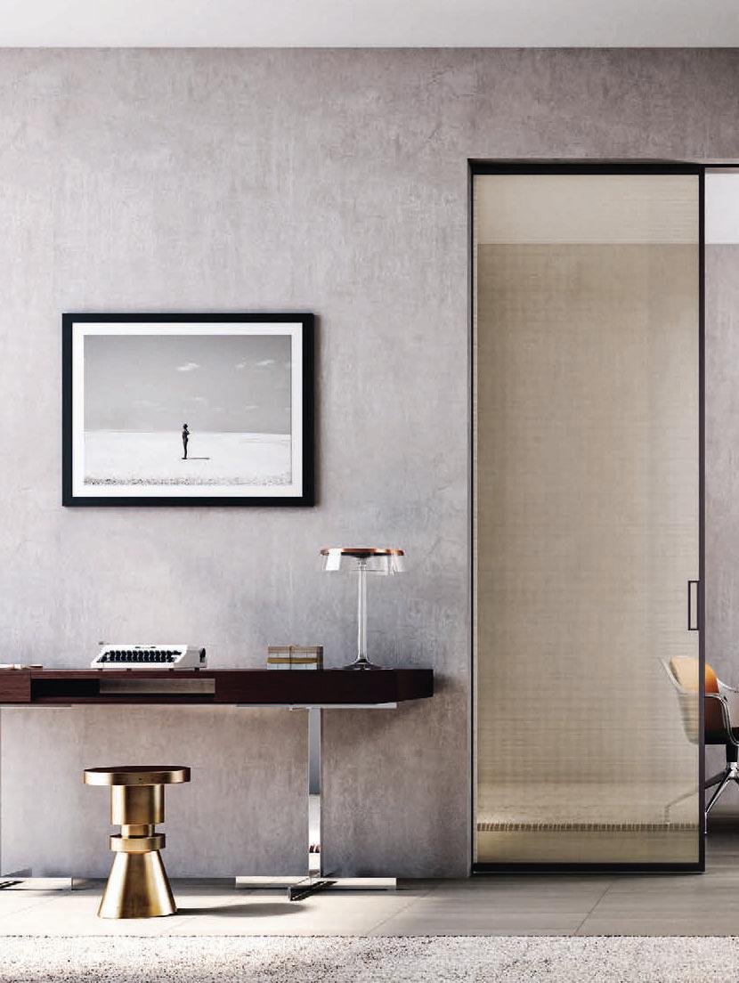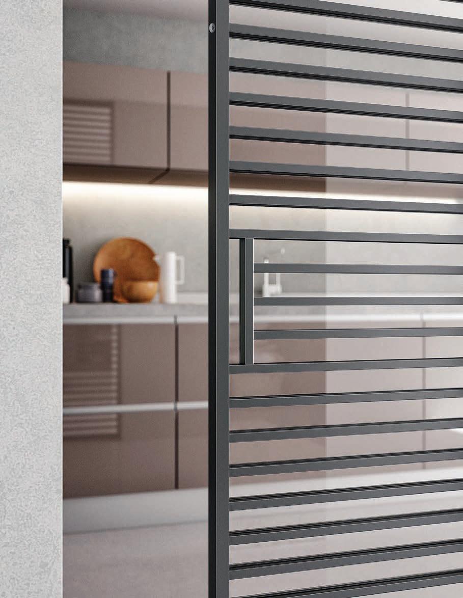 Filomuro flush doors can be installed in hinged or pocket versions, made-to-measure and floor-to-ceiling. Visible aluminium structure, door leaf available in different materials: wood, glass or laminate.