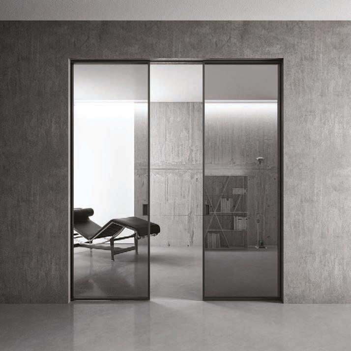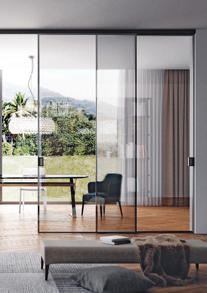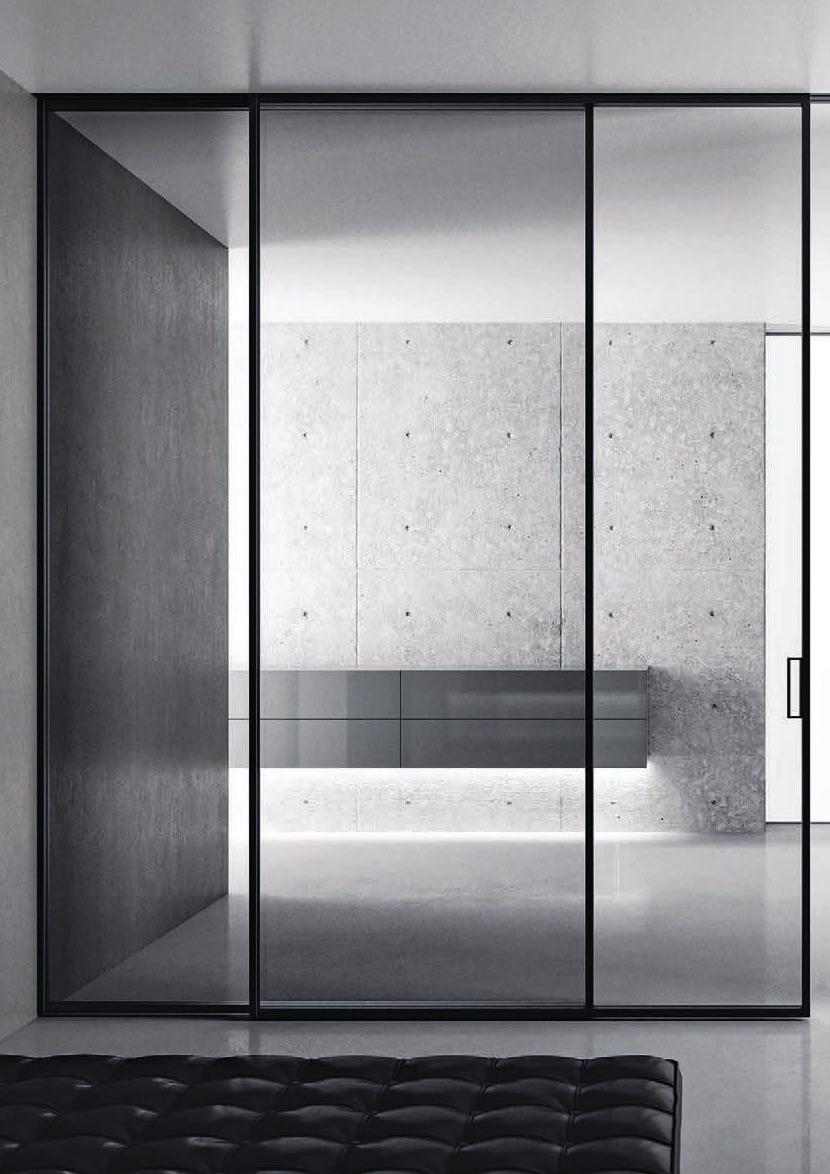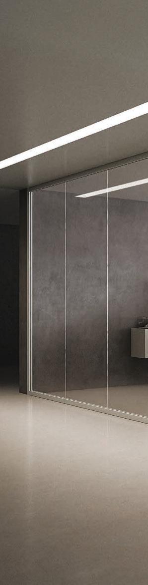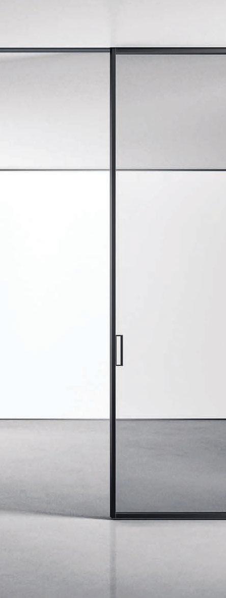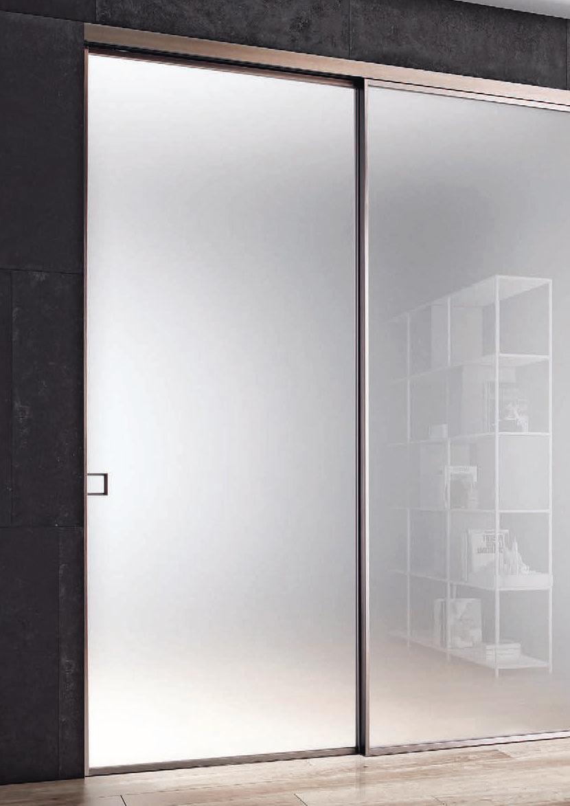Plana Crystal presenta un cristallo singolo a filo perimetrale con maniglia a incasso. La versione Plana System con binario a incasso è pulita e lineare. La tecnologia applicata ai sistemi scorrevoli li rende affidabili e silenziosi in esercizio, una scelta di qualità e di stile. / Plana Crystal is a single panel of glass mounted flush to the frame with a recessed handle. The Plana System version with recessed ceiling track is neat and linear. The technology used in the sliding mechanism provides silent, reliable performance, a choice of quality and style.