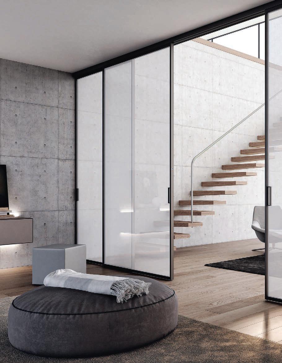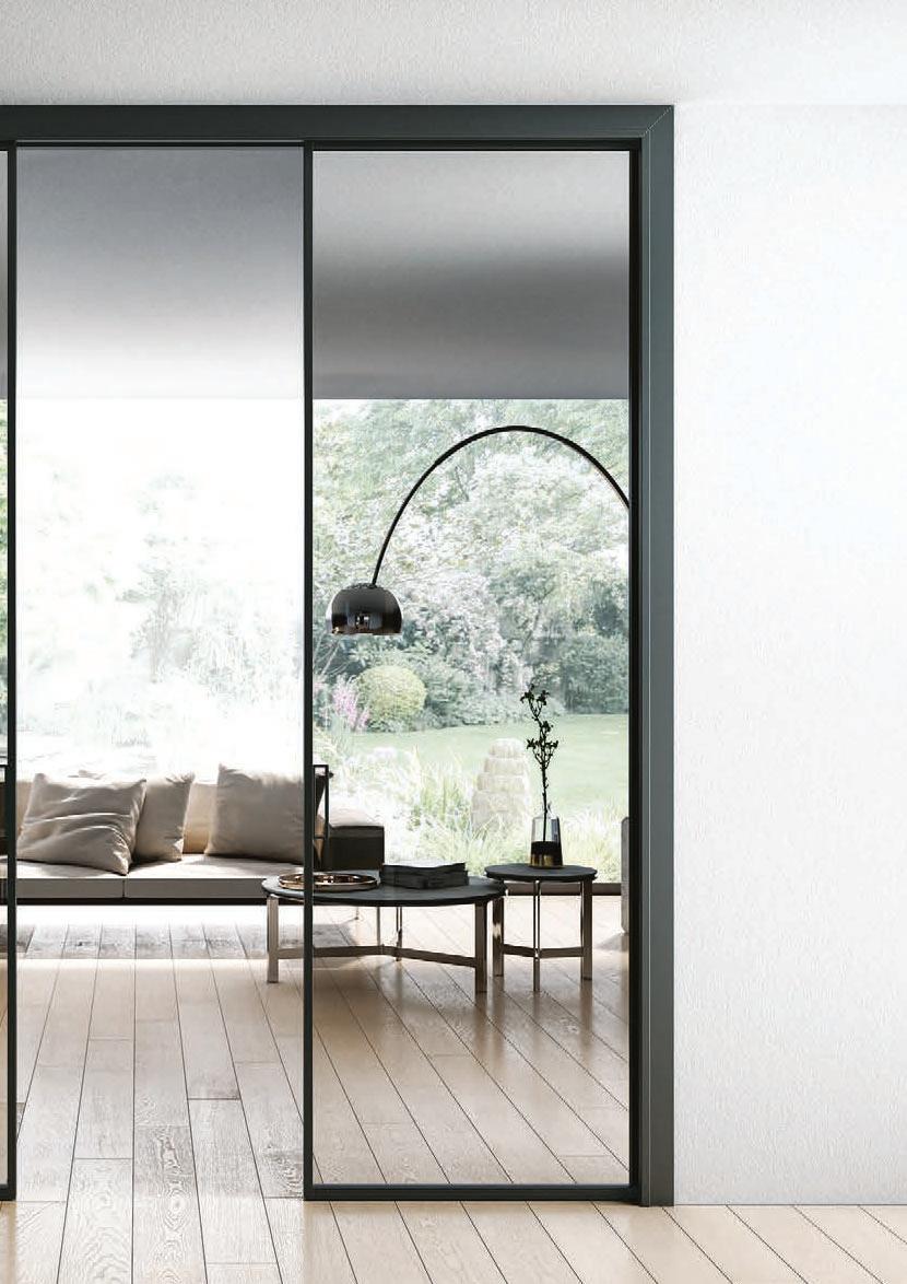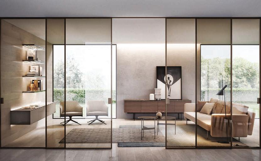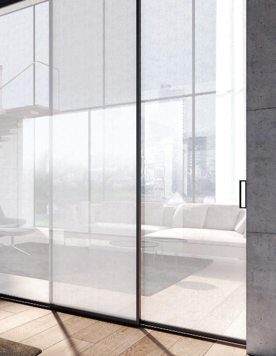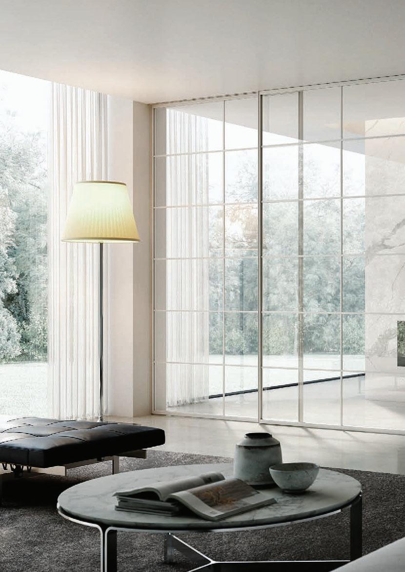 Plana Crystal presenta un cristallo singolo a filo perimetrale con maniglia a incasso. La versione Plana System con binario a incasso è pulita e lineare. La tecnologia applicata ai sistemi scorrevoli li rende affidabili e silenziosi in esercizio, una scelta di qualità e di stile. / Plana Crystal is a single panel of glass mounted flush to the frame with a recessed handle. The Plana System version with recessed ceiling track is neat and linear. The technology used in the sliding mechanism provides silent, reliable performance, a choice of quality and style.
