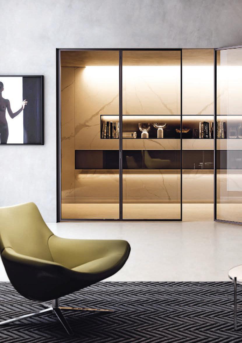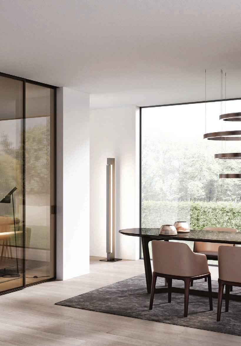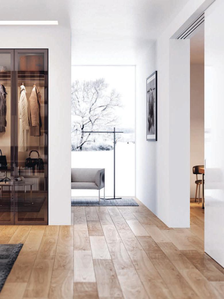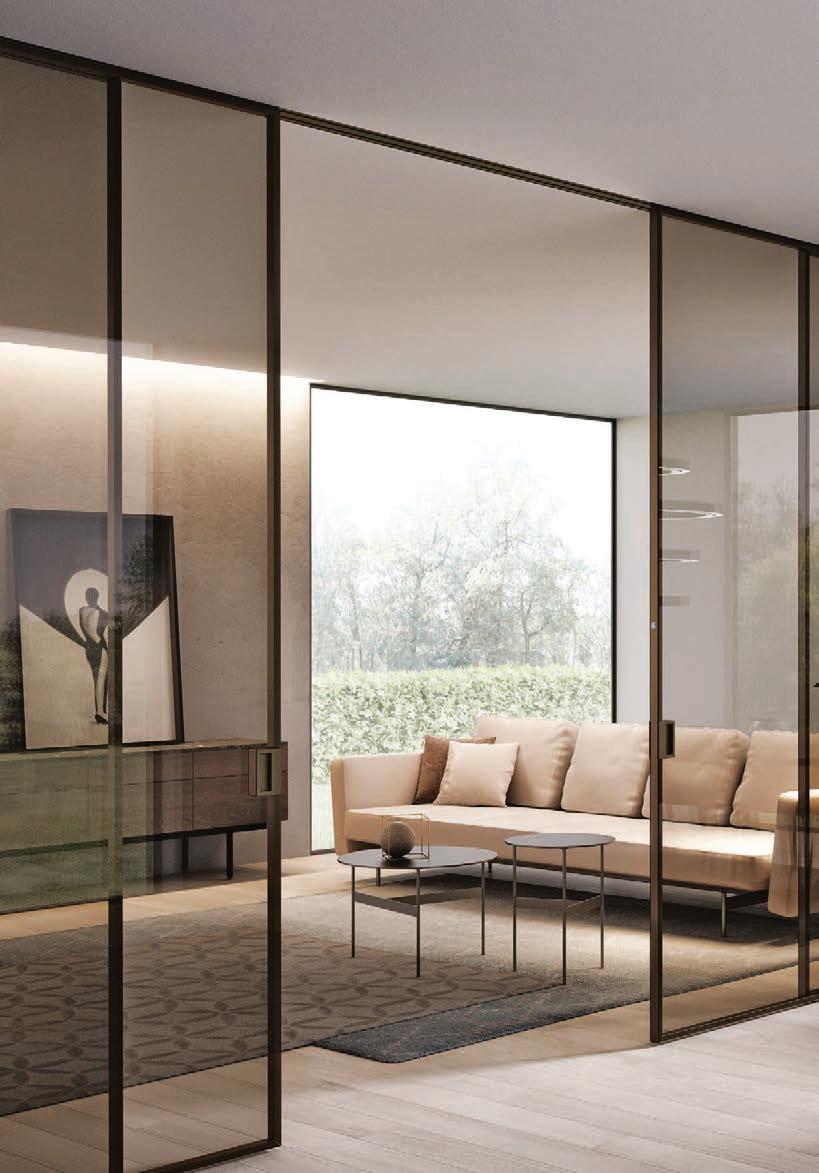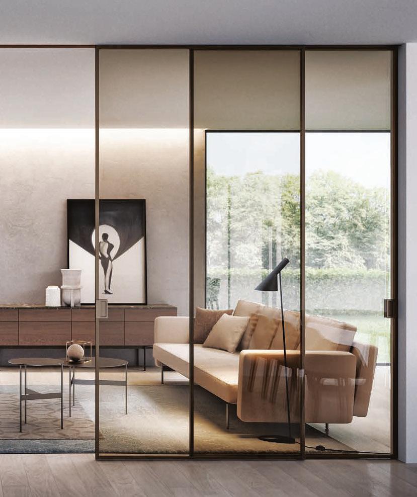 Plana Crystal presenta un cristallo singolo a filo perimetrale con maniglia a incasso. La versione Plana System con binario a incasso è pulita e lineare. La tecnologia applicata ai sistemi scorrevoli li rende affidabili e silenziosi in esercizio, una scelta di qualità e di stile. / Plana Crystal is a single panel of glass mounted flush to the frame with a recessed handle. The Plana System version with recessed ceiling track is neat and linear. The technology used in the sliding mechanism provides silent, reliable performance, a choice of quality and style.
