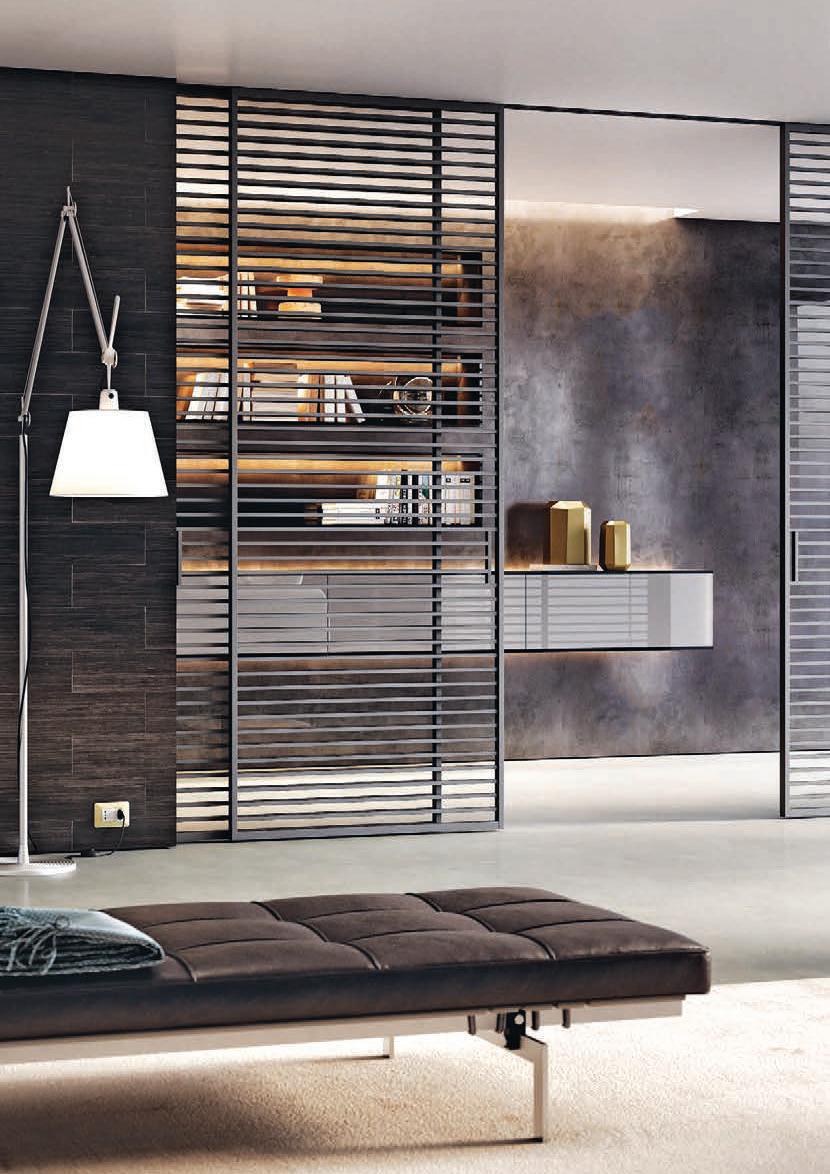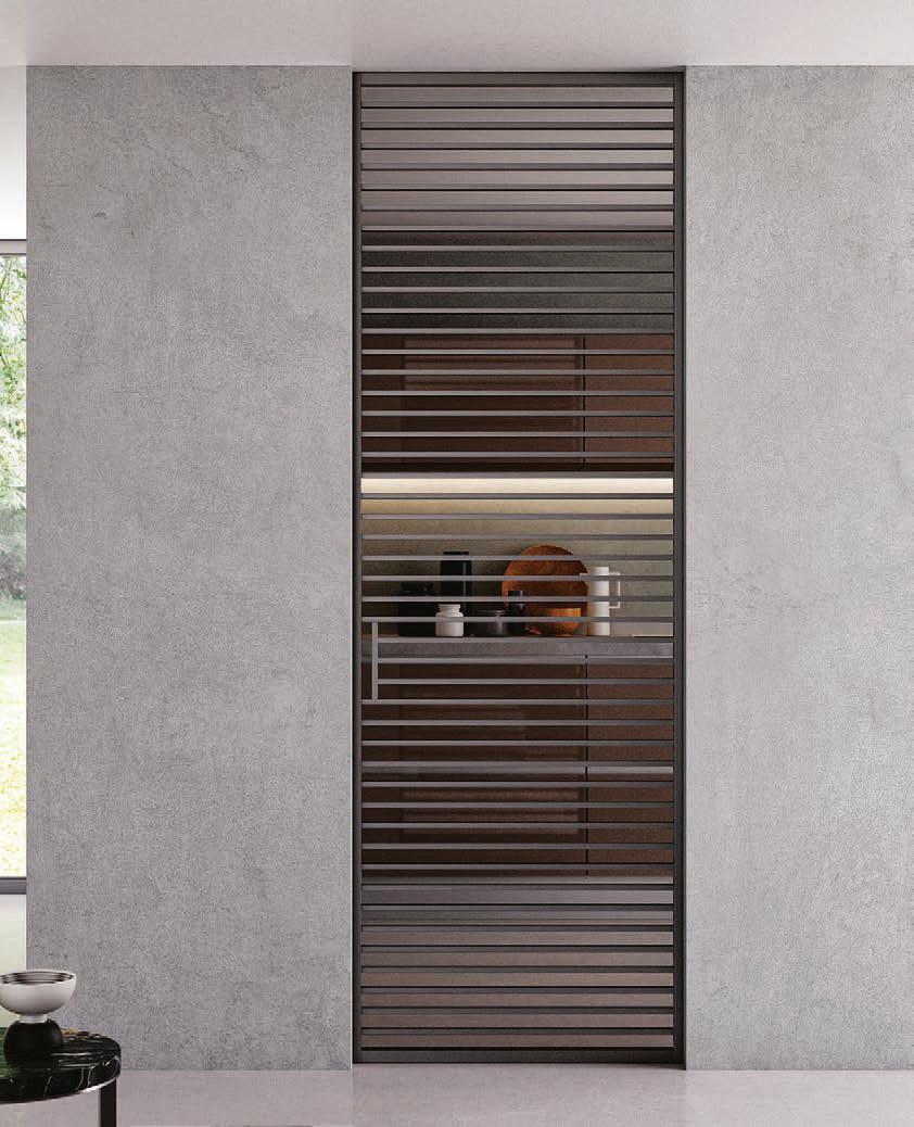 Plana System con binario a incasso, porte divisionali scorrevoli Crystal struttura alluminio finitura Antracite, cristallo Stop-sol Fumé, maniglia Link a incasso. / Plana System with recessed tracks, Crystal sliding divider doors, Antracite finish aluminum frame, Stop-sol Fumé glass, recessed Link handle.