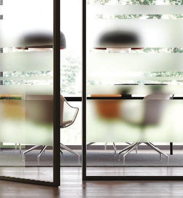 Plana System with ceiling tracks, Unik sliding divider doors, Antracite finish aluminum frame, Lino Bianco patterned glass, Slide handle.