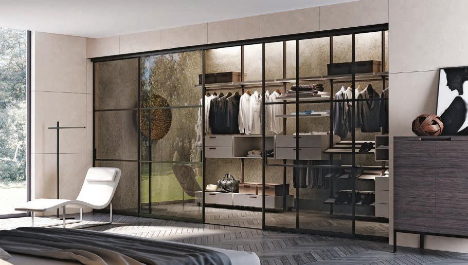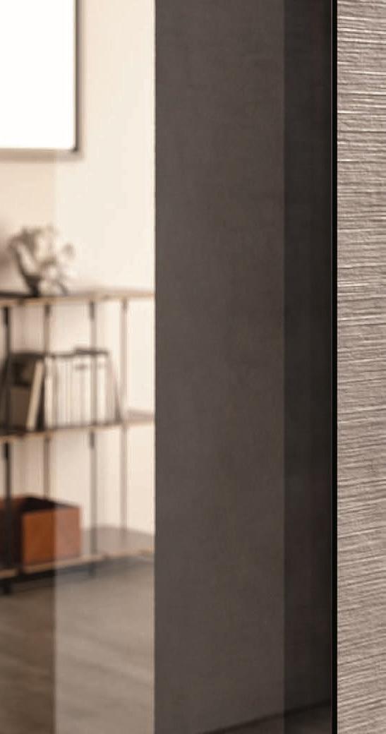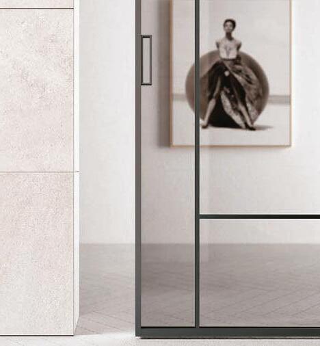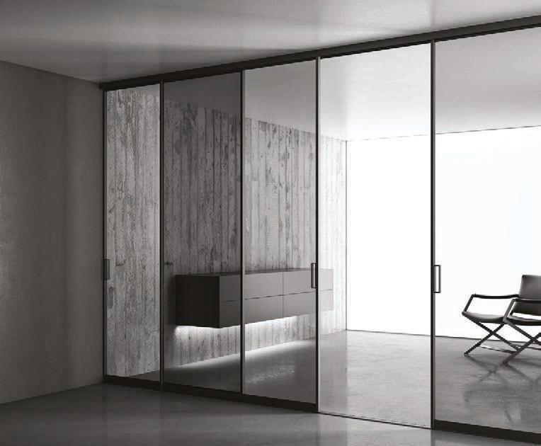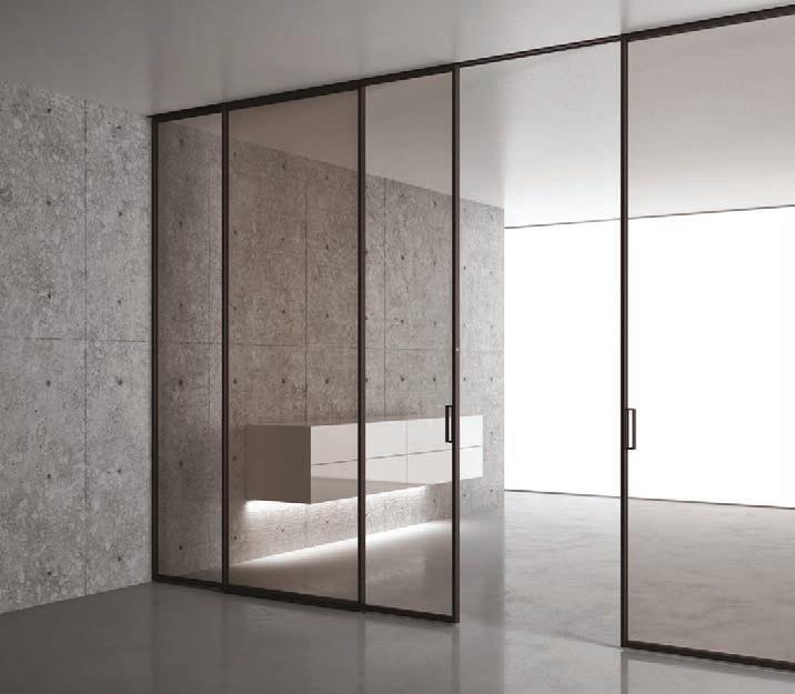 Fumé glass, Slide handle. Plana System with wall tracks, Kansas sliding divider doors, Unik profile, aluminium structure, Antracite finish, Trasparente Extrachiaro Glass.