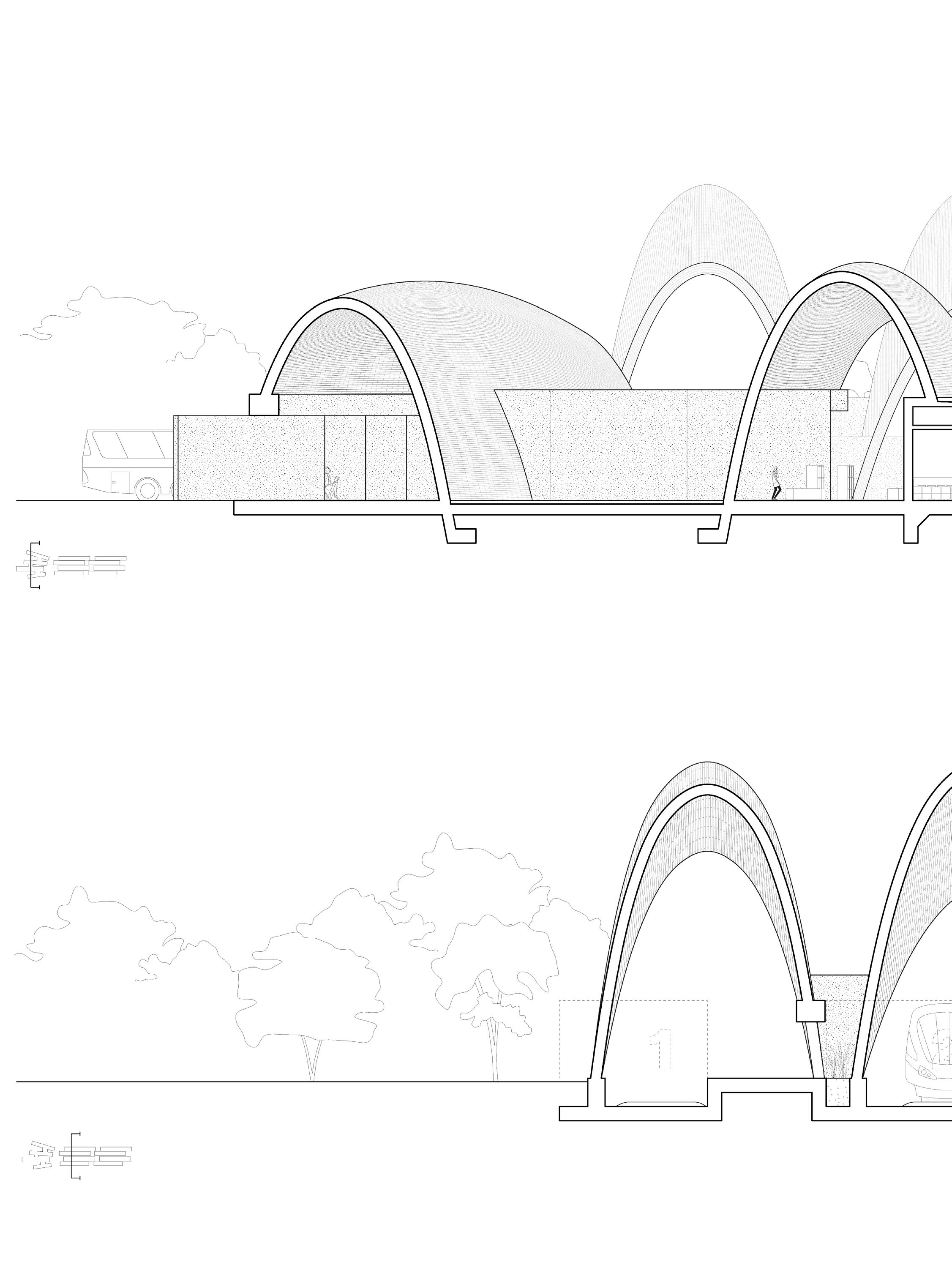 This project is also an investigation into mass timber as a structural system. Concrete panels comprise a majority of the exterior walls with the exception being when the roof of wooden slats curve to meet the ground. With mass timber as a device to facilitate this formal move, the overall materiality of the project can be experienced through touch.