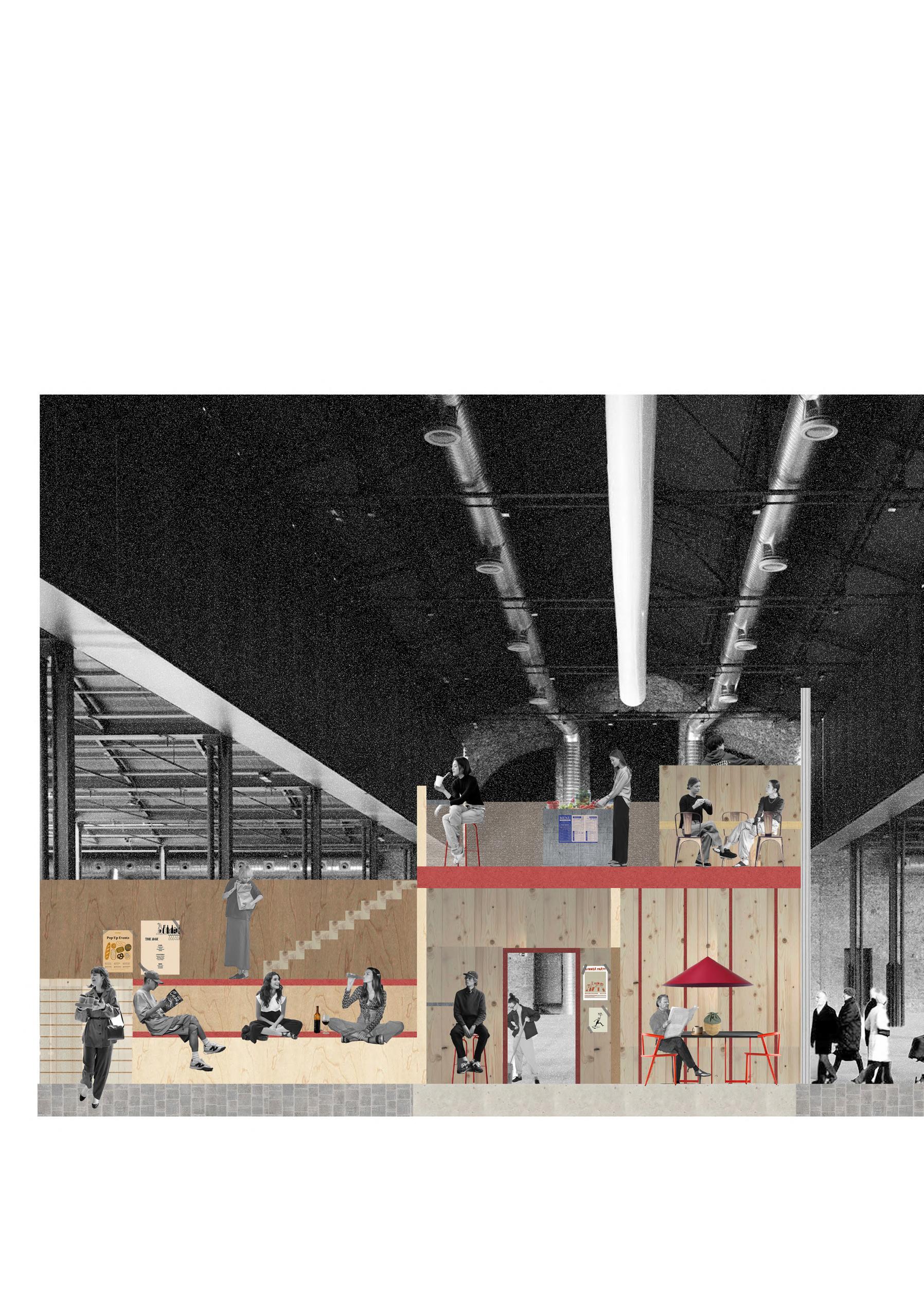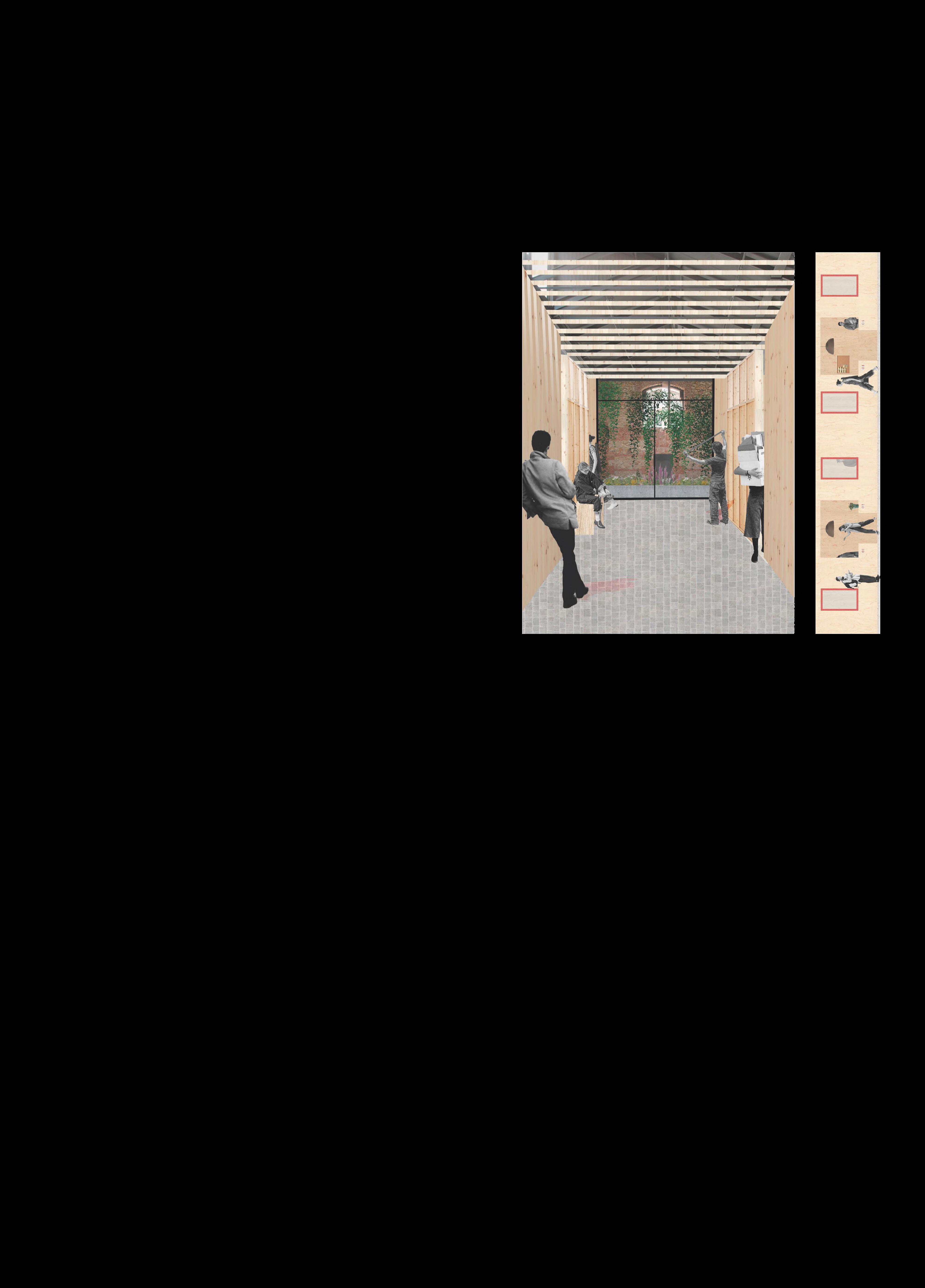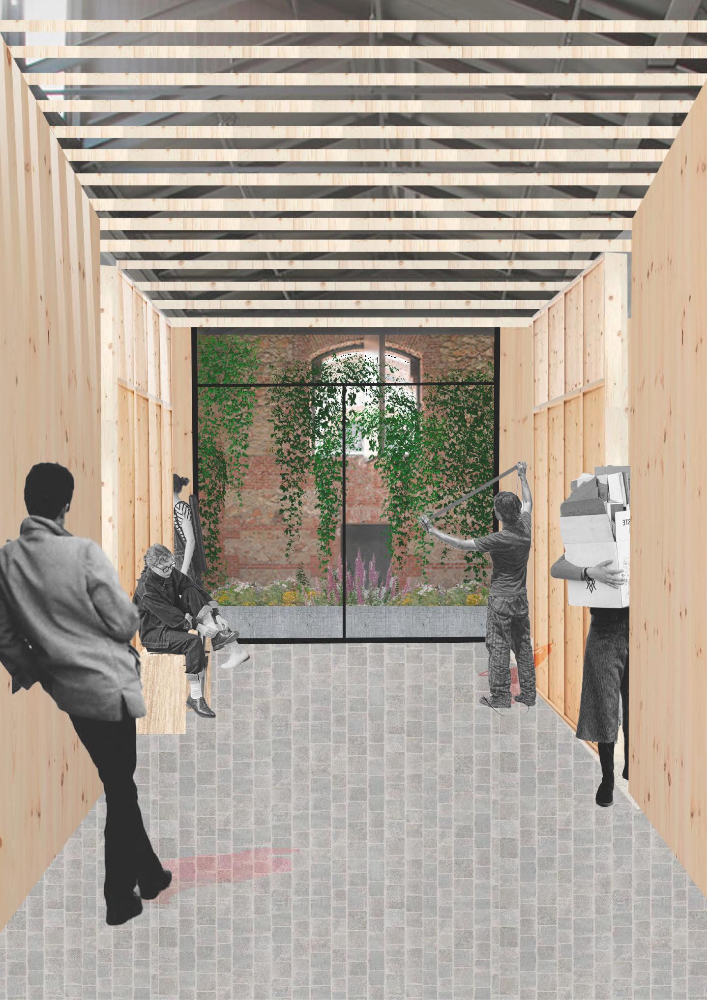 ZONA A Zona intermedia, uno de los ensanches de vertebrae, en este caso es la entrada a la zona de los talleres, son dos zonas entrentadas, creando una conexion estre sus dos espacios de transición.
