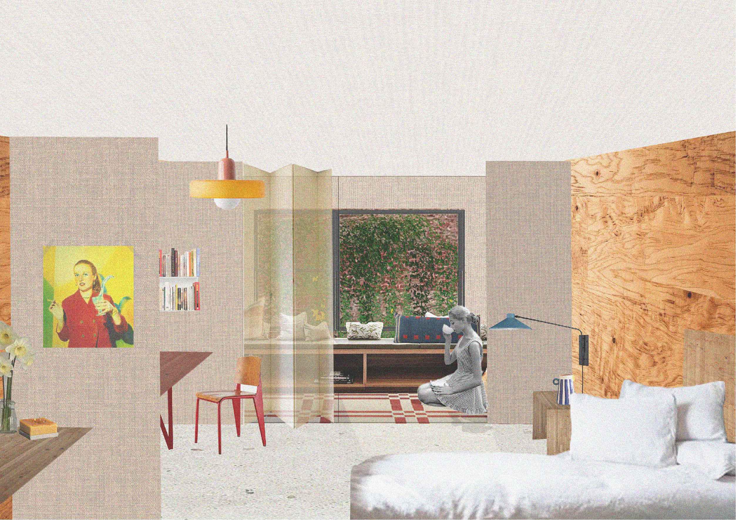 Para la ventilación de las habitaciónes se retranquea nuestra linea de hbaitación y se crea un jardín con ventilación tanto por las ventanas de la nave com por la cubierta, creando una ventilación cruzada y aseguradno la ventilación de todas las habitaciones.