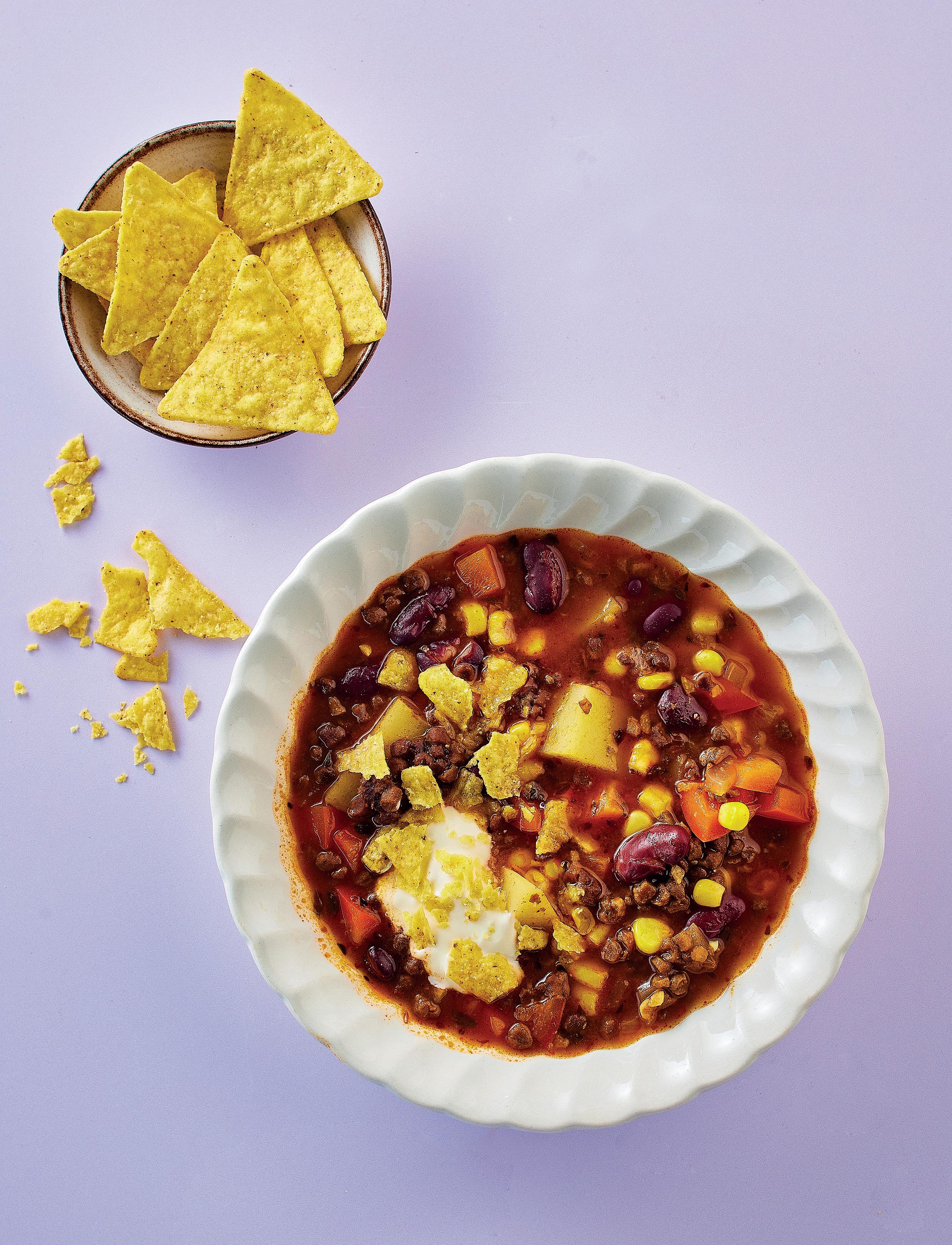 Lisää liemeen paprika, pakastemaissi ja pavut.