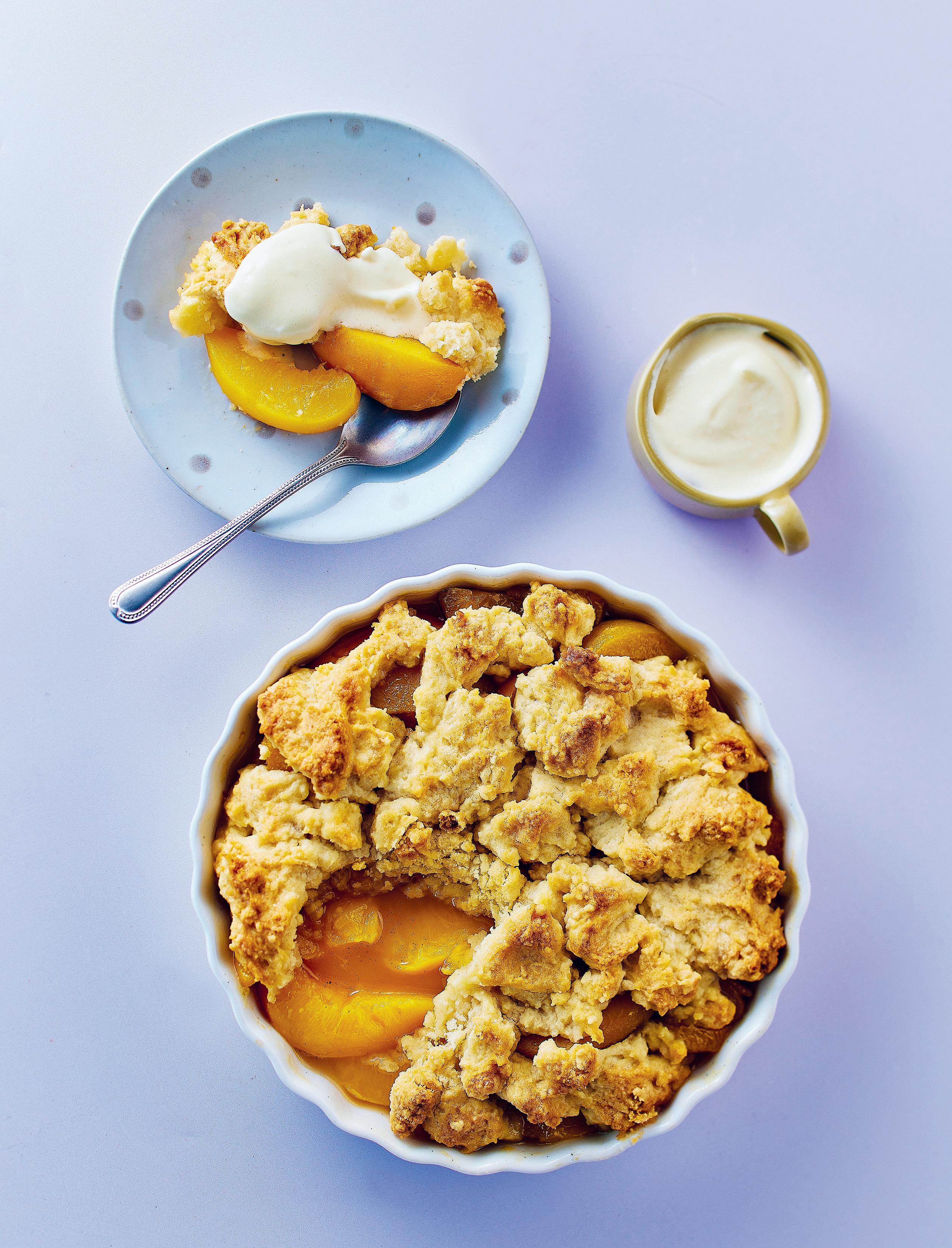 4. Ripottele kuorrute persikoiden päälle vuokaan ja paista 180 asteessa 35–40 minuuttia.