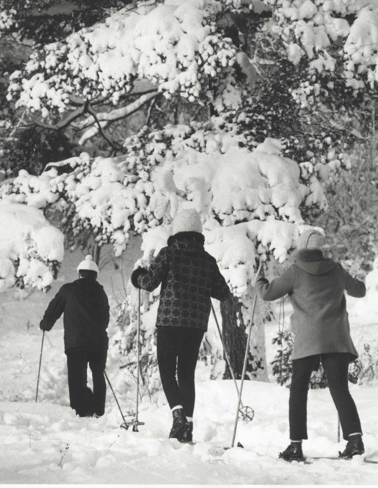 1960-luvun hiihtomuodissa villa oli yhä keskeinen materiaali. Paksut päähineet ja lämpimät takit pitivät hiihtäjät lämpimänä.