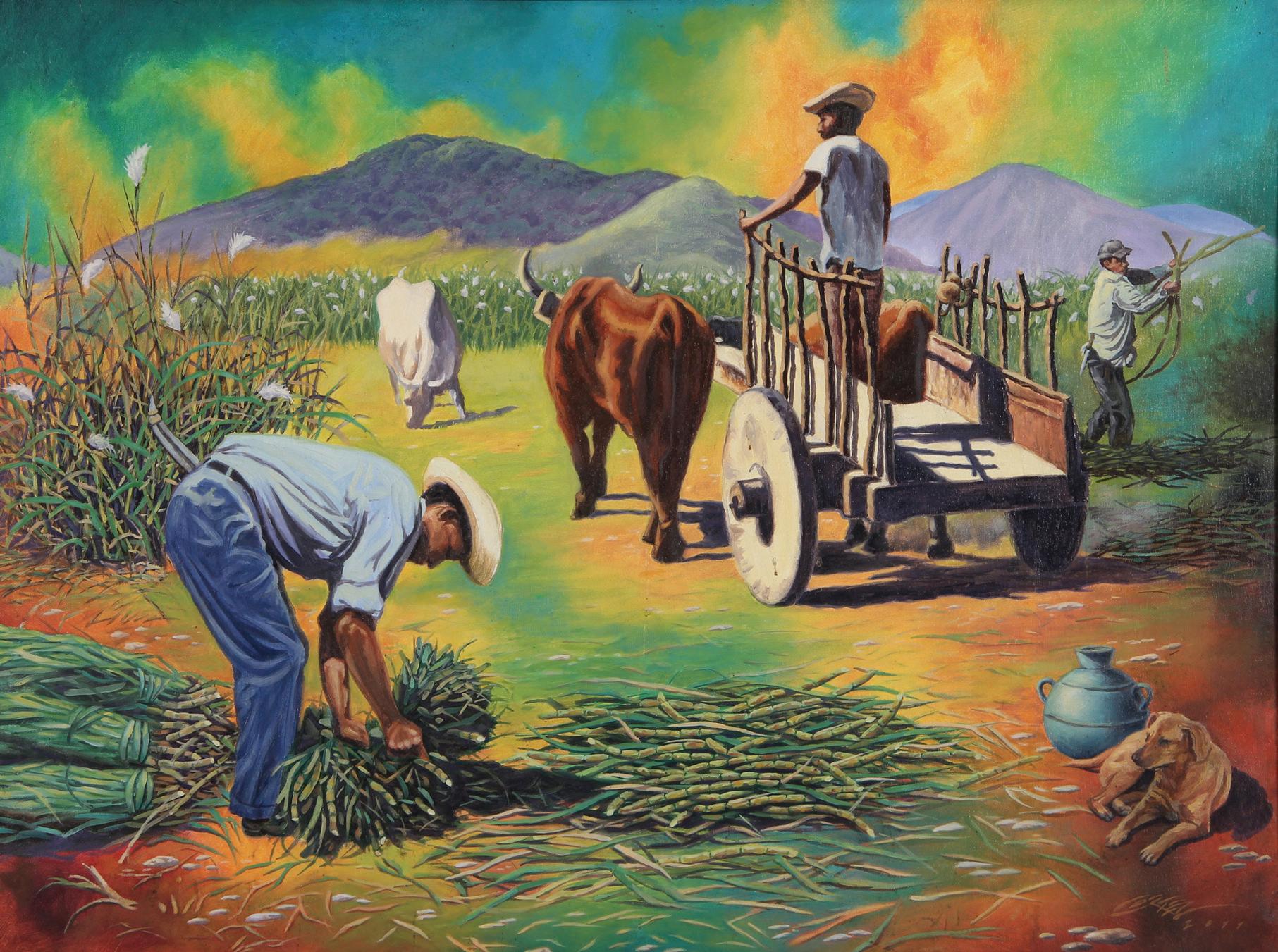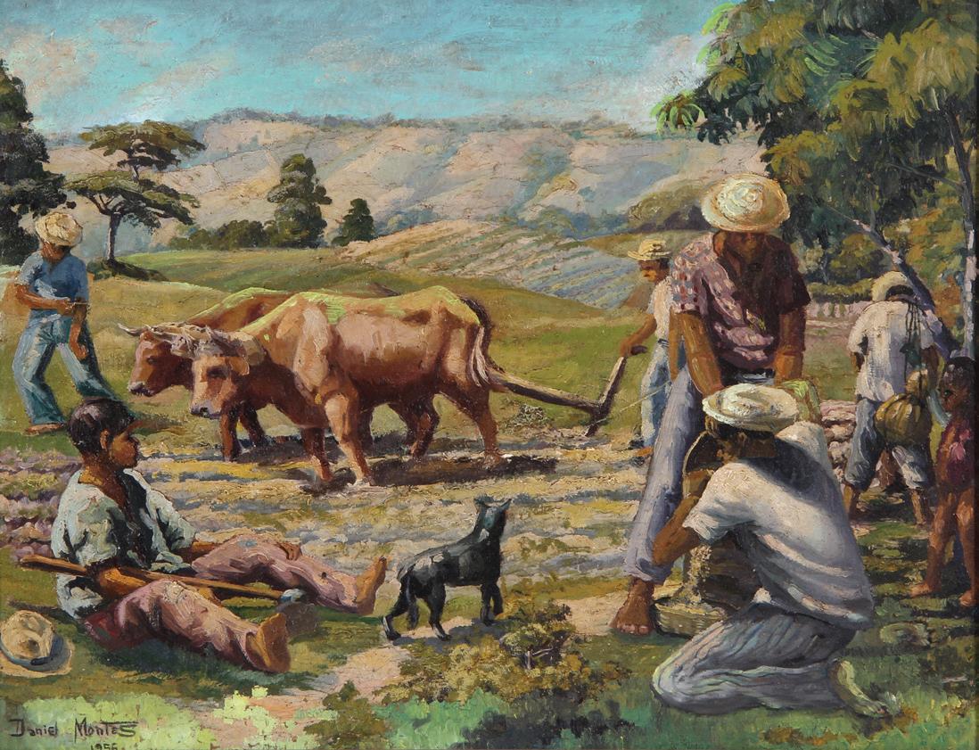 Existe un proceso de transición sutil de la representación realista del trabajo y de la vida cotidiana del campo a una idealización en la plástica local. Ejemplos de este realismo son: la obra de Mejía Vides, “Las curuleras” (Fig. 6 ) (obra en la exposición Trópico Telúrico), donde dos mujeres sentadas en la tierra laboran en la extracción de mariscos en la costa salvadoreña. Así mismo, Max Vollmberg de 1917 (Fig. 7), por su parte, muestra a famélicos caballos y vacas propios del campo salvadoreño, bajo el también característico, quemante sol de la tarde.En la obra de Daniel Montes, se observan hombres ejecutando una diversidad de actividades, propias del entorno agrario, en una visión no exenta de la dureza de la faena, pero al parecer más interesada en la idea del tesón pintoresco (Fig.8)