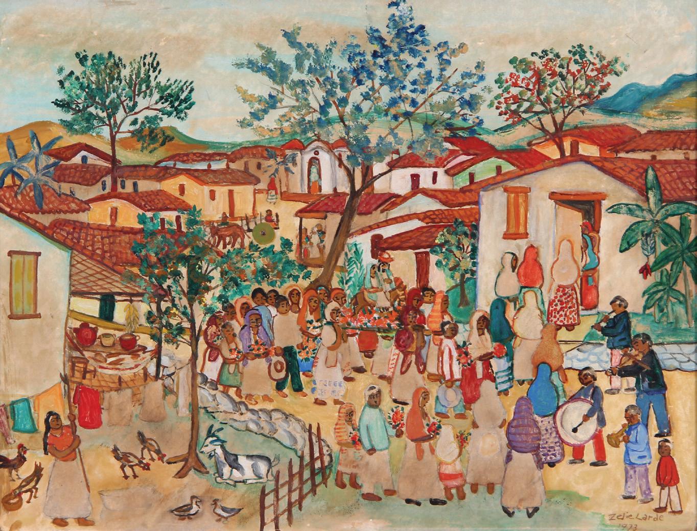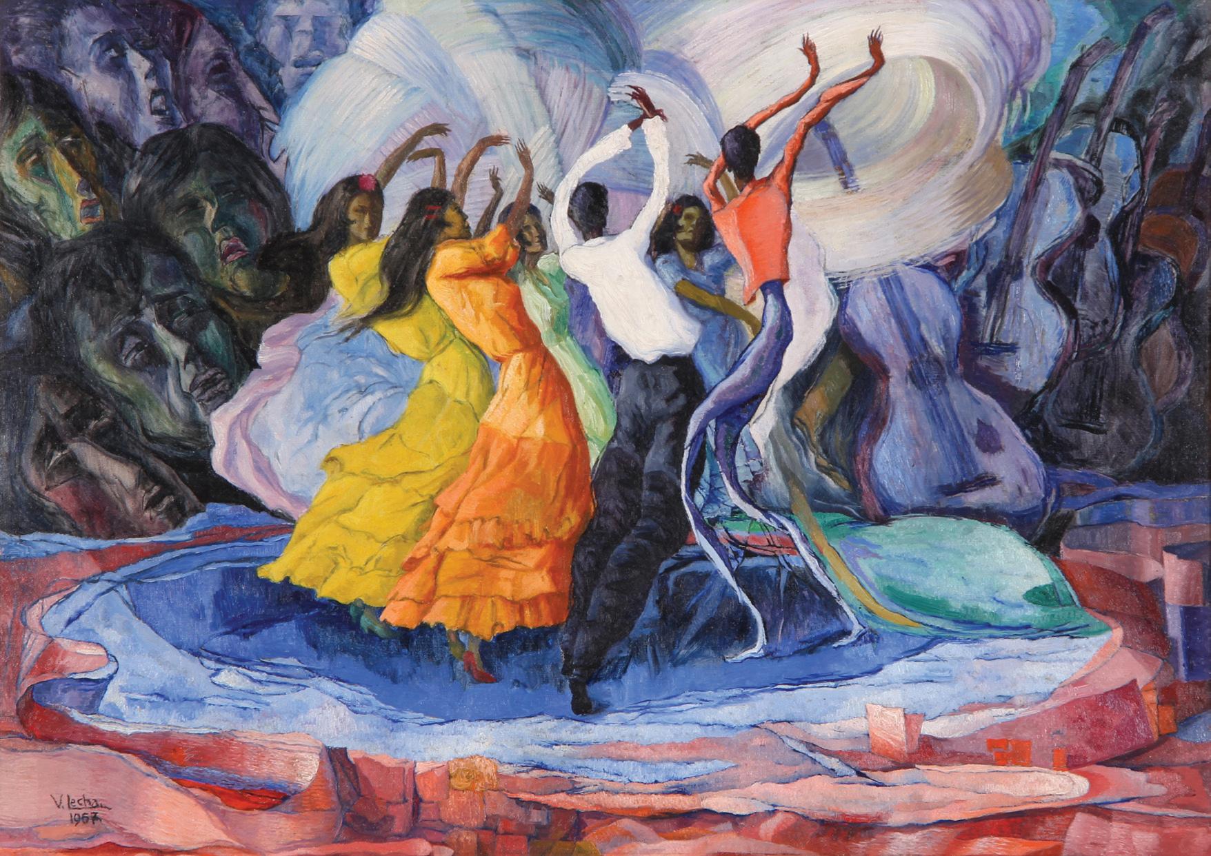 Los procesos de modernización que llevaron a la población a vivir en la ciudad también se reflejan en la obra plástica, la “Danza” (Fig. 82), de Valero Lecha muestra una escena de baile en la cual parece surgir agua del suelo árido, con el viento girando con fuerza sobre ellos, enfatizando el movimiento de los bailarines. Esta obra destaca la música, el baile y la expresividad como elementos clave en toda fiesta.