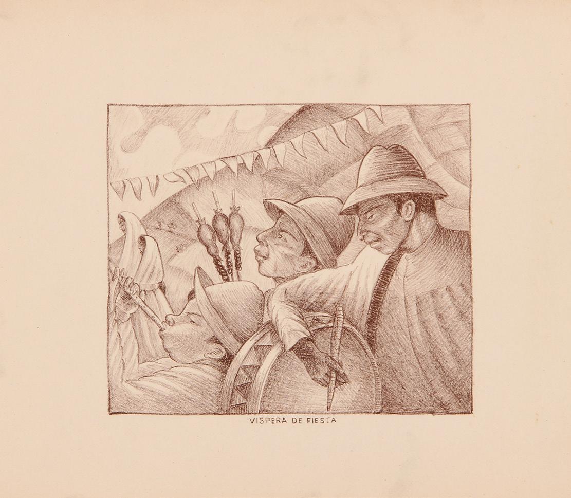 Entre los personajes se encuentra a mujeres representadas con un vestido similar al de las volcaneñas, nombre con el cual el indigenismo salvadoreño bautizó a las habitantes de las faldas del volcán de San Salvador. Sin embargo, uno de lospersonajes masculinos es tan delgado, que muestra el movimiento y el dinamismo del cuerpo. Estas estilizaciones se alejan de las representaciones reales y se acercan más a una pintura expresiva, idea que podría destacar cuando observamos los rostros al lado derecho de la obra que parecen corear alguna canción. La oscuridad de los mismos, les asigna cierto dramatismo; y se evidencia el tema de la música, con los instrumentos en el lado izquierdo del cuadro. Así, este lienzo dentro de la exhibición destaca un elemento clave en toda fiesta: la música, el baile, y la expresividad que estos permiten.