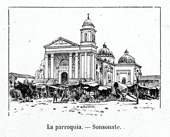 Era una época donde la vida estaba más ligada al campo y a las producciones agrícolas. Por ejemplo, en la “Vista general de Sonsonate” (Fig. 2), podemos observar una distribución de sus calles en cuadrícula, con vegetación abundante, especialmente a lo lejos y rodeando todo el asentamiento, en una estampa que sugiere más a un pueblo que a una ciudad. En la segunda imagen, “Vista de una calle de Sonsonate” (Fig. 3) nos adentramos en las calles de Sonsonate y se presenta una escena que hoy en día podemos relacionar con un pueblo colonial. En la tercera, vemos “La parroquia de Sonsonate” (Fig. 4),es el telón de fondo de “tenderetes”,puestos del comercio en pequeño, reflejo inmediato del activo comercio local pero también con las reminiscencias coloniales de la venta en la plaza.