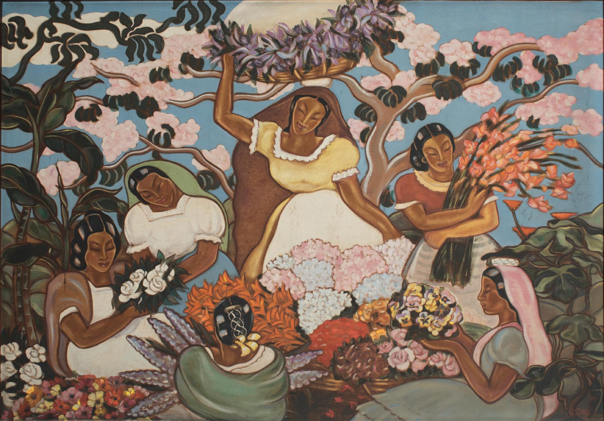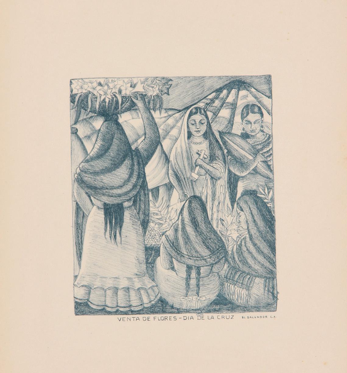 En esa misma línea, los grabados de Alfredo Cáceres Madrid (exhibidos en la exposición “Trabajo, Fe y Gozo”) (Fig. 11, 13 y 14) o la obra de Ana Julia Álvarez (“Vendedoras de flores”, en la exposición Trópico Telúrico), (Fig. 15), nos muestran escenas del trabajo idealizadas, donde se enfatiza la belleza de las mujeres, la abundancia de los frutos del campo, y en las cuales las cargas parecen ligeras, el sol se percibe poco abrasador y los trajes no muestran ningún desgaste. De tal manera, que se embellecen[4] las escenas.