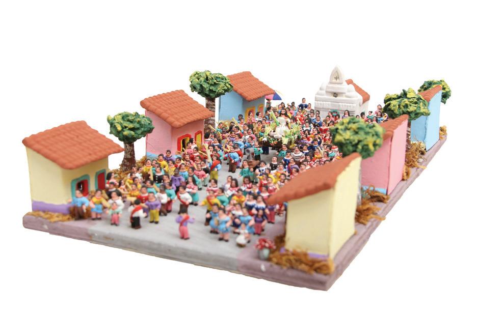 hace referencia a una tradición de San Juan Nonualco y otras localidades del país. Esta pieza alude a las celebraciones relacionadas a los cultivos, a la abundancia de la cosecha, a la vida agraria y a la comida, temas relevantes durante las fiestas en distintas localidades del país. Las frutas de barro hechas en Ilobasco por autores anónimos y la pintura “Sin título”, de Rosario Mirón (Fig. 80), que muestra frutas y dulces típicos en un recipiente de vidrio, evidencian la importancia de la comida, como elemento simbólico e indispensable durante la fiesta.