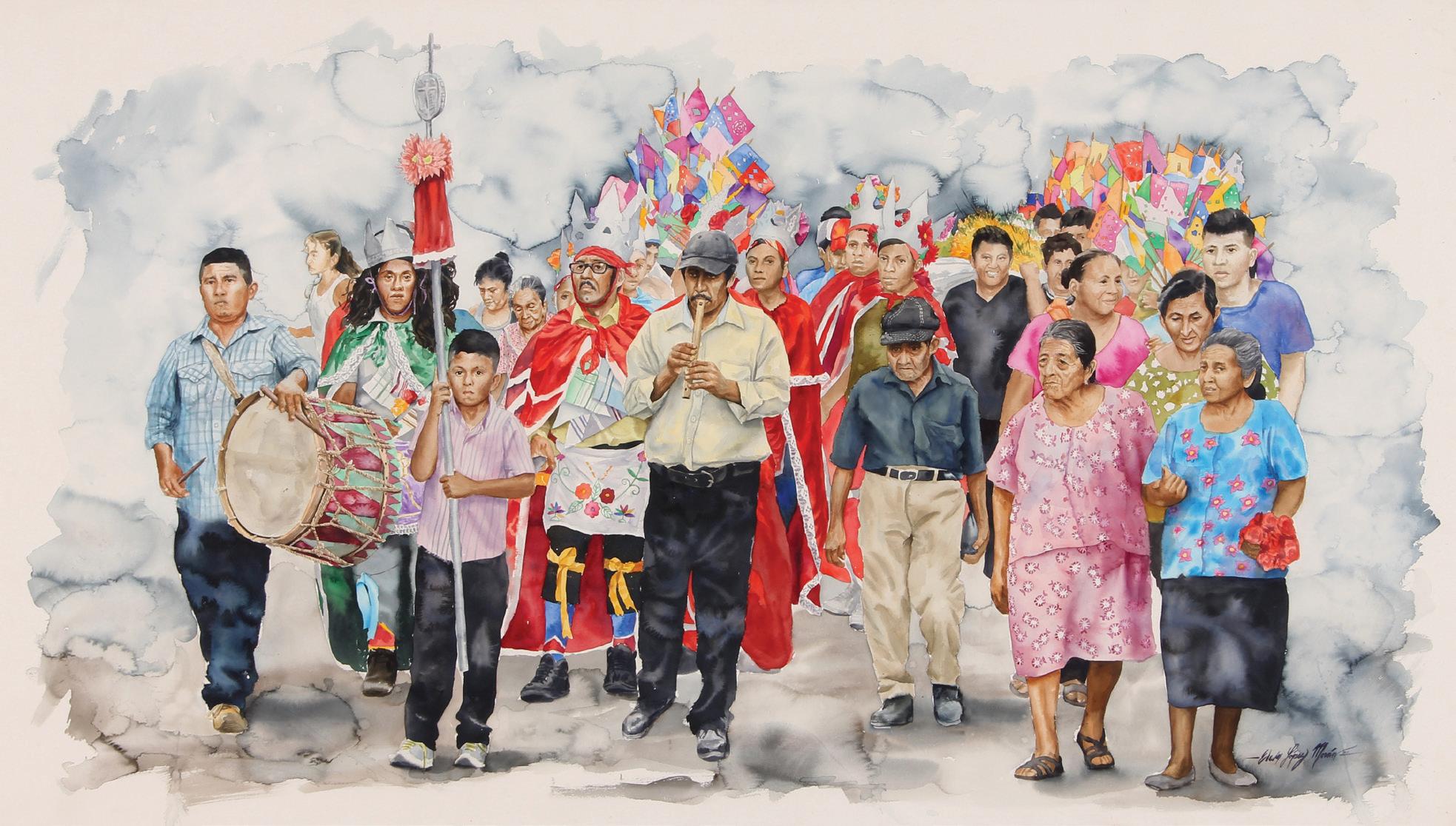 Estos elementos, como la música y el torito pinto, se encuentran en distintas celebraciones alrededor del país. “Procesión con pito y tambor”, de Edwin López (Fig. 78), hace referencia a la danza de “Los moros y los cristianos”. La procesión, encabezada por músicos, deja ver a algunos historiantes en segunda fila, y, más atrás a distintas personas que los acompañan, una escena común en las celebraciones locales.