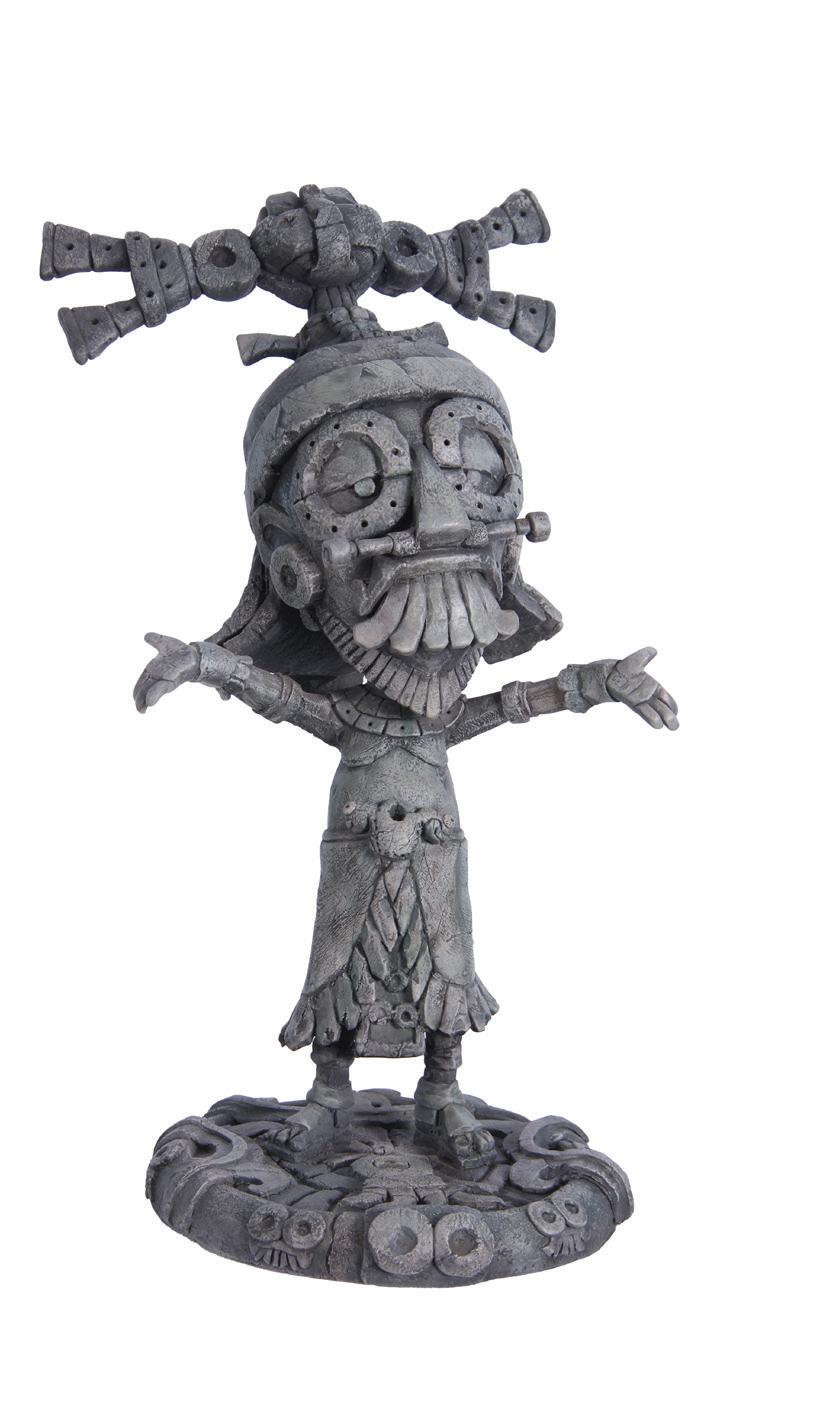 La cultura y la identidad local, siguen cambiando y adaptándose a los eventos y a las épocas, provocando un sincretismo, que podemos reconocer en las obras como “Ghettoblaster I y II”, de Defie (Fig. 85 y 86). Estas piezas están inspiradas en la obra “Tocado Ghettoblaster”, de otro artista salvadoreño de la diáspora Guadalupe Maravilla, quien viaja como inmigrante ilegal a Estados Unidos en su infancia, y convive con el Hip Hop en ese país en los años 90; Las piezas de Defie poseen una estética y unos medios mucho más actuales, como impresiones digitales sobre casetes y escultura 3D, que abonan a la construcción de un estética local, y que en el caso de Defie usa elementos que recuerdan a las “máscaras de jaguar” [17] , que ya hacen parte de la cultura local, creando un remix visual de elementos y capas de significados que atraviesan siglos y subculturas de diferentes contextos.
