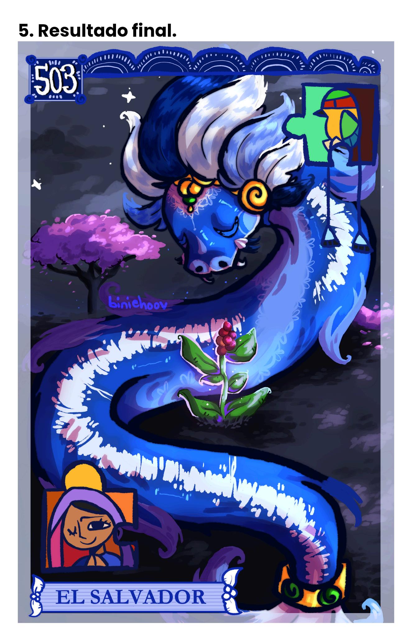 Ya que hablamos de una memoria, quería que la ilustración representase una especie de "sueño onírico", como una memoria lejana de nuestro país. Primero vemos al Quetzalcóalt, dios maya mítico representando las raíces indígenas de El Salvador junto con un pequeño Maquilishuat al fondo. Dicho dios rodea una pequeña planta de café, lo cuál, a mi ver, es lo más simbólico de nuestro país. A su vez quise agregar una imitación al arte de Fernando Llort, en los cuáles represento a La Virgen María y al ave Nacional, El Torogoz. Por último, quise también que el dibujo se asemejase al Colón salvadoreño, siendo ya lo último que es el recuerdo más "cercano" a la actualidad de nuestro bello país. El título "Infancia" viene a que en la ilustración se ponen recuerdos del pasado, recuerdos que pueden generar cierta nostalgia así como cuando nosotros mismos recordamos nuestra niñez. Recuerdos que nos muestran una vida más simple y tranquila.
