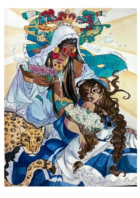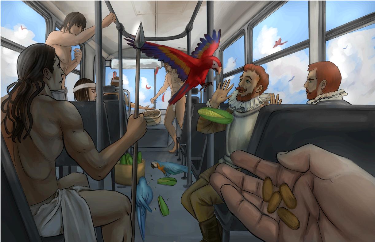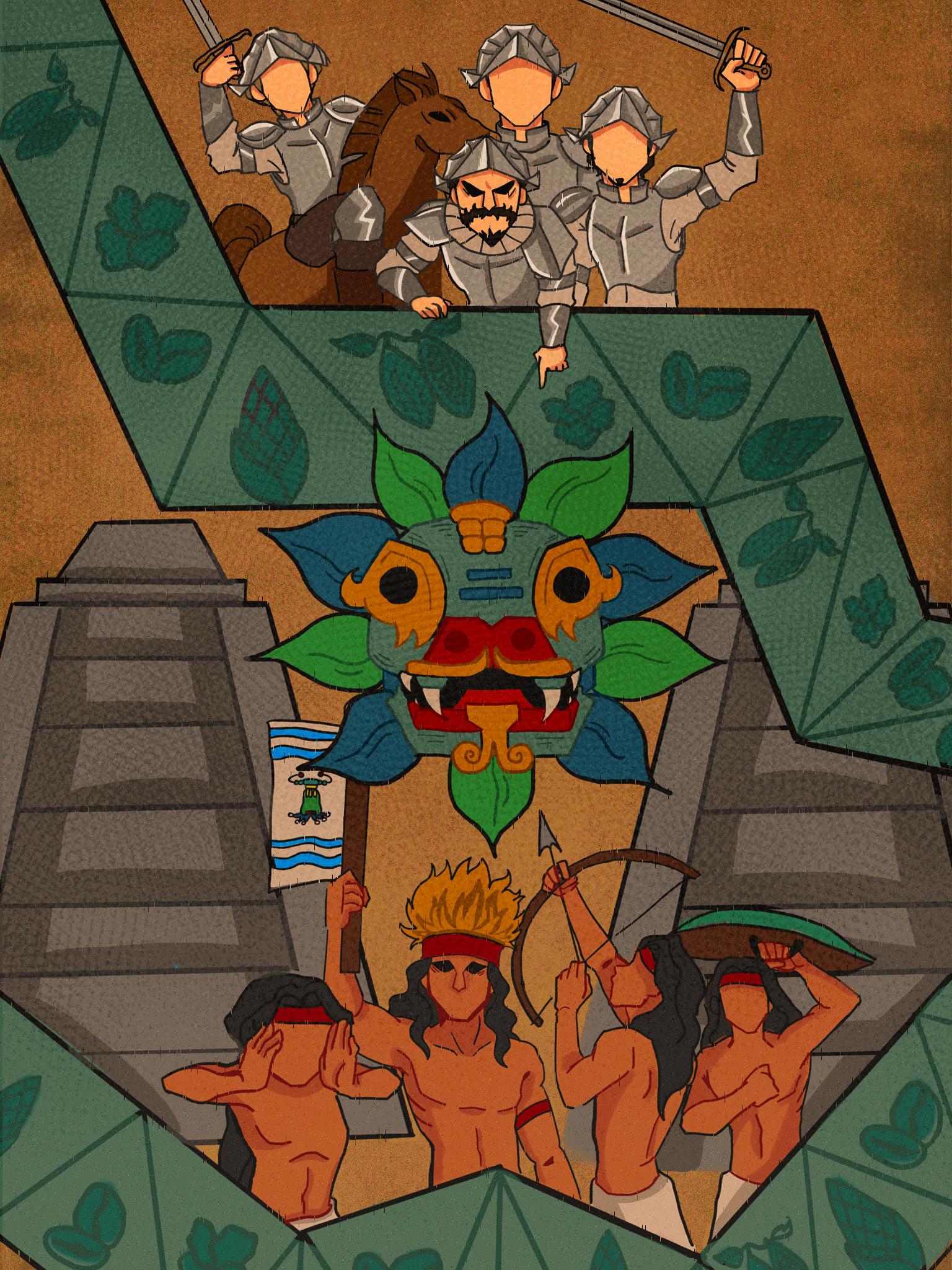 Con mi ilustración retraté una situación de conflicto por la que nuestro país atravesó, pero de una forma más metafórica, la tensión social era evidente, esto lo representé con las miradas de desdén que los personajes de la escena se dirigen mutuamente, el choque cultural que significó la conquista española y cómo cambió drásticamente nuestra cultura a partir de ello, la ilustración tiene pequeños mensajes ocultos, como el robo del maíz que es una crítica a la explotación y robo recursos naturales de nuestras tierras, así como el que las aves retratadas son guacamayas, dando a entender el contraste entre pipiles y españoles, siendo la minoría los españoles (los cuales también representan a Pedro de Alvarado y Gonzalo de Alvarado).