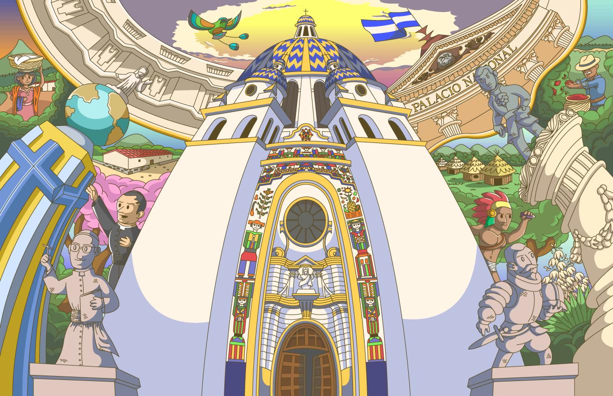 La obra es un conjunto de personajes, edificios y elementos históricos que están enlazados con todo lo que ha pasado en San Salvador a través de los años.